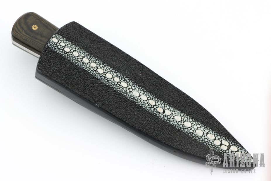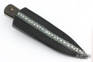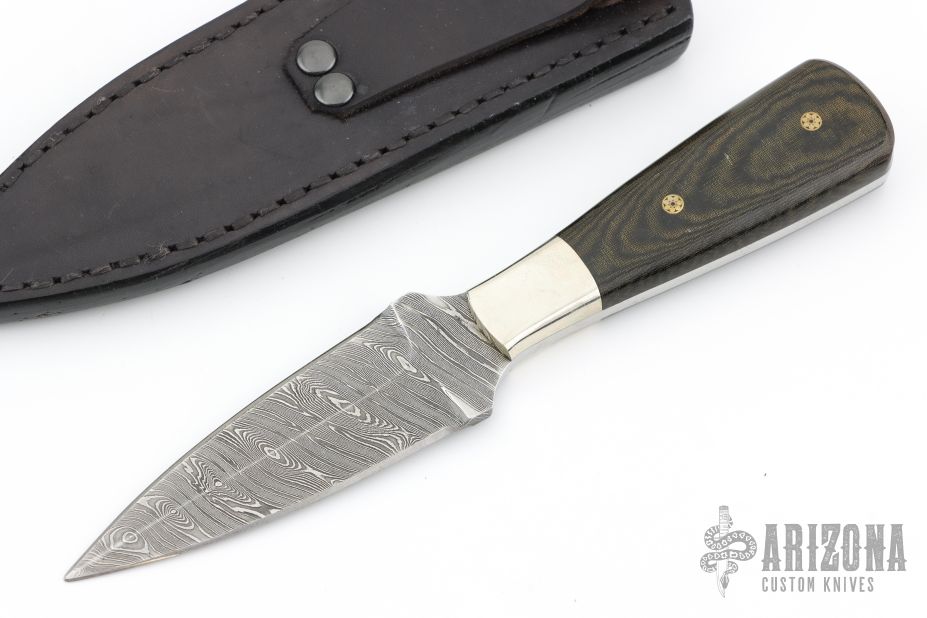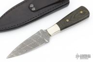 This knife by Jim Ort features a Damascus double blade with .167" blade stock and 1.321" blade depth, full tang construction. The handle has nickel silver bolsters, black linen micarta scales with mosaic pins. Comes with a black leather sheath with stingray skin overlay. New from maker.