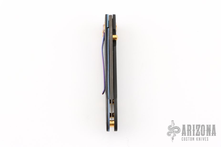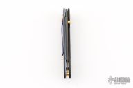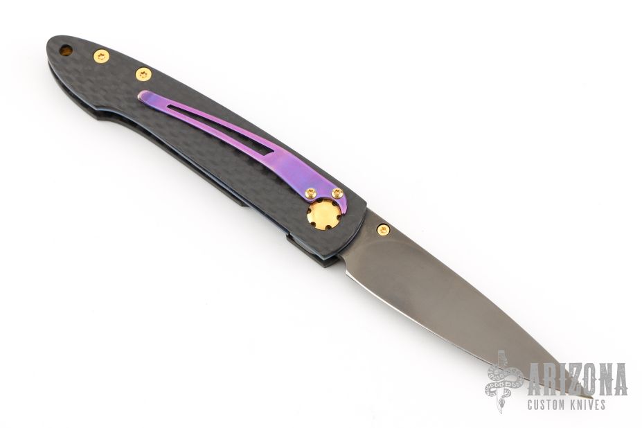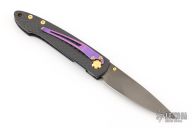 This Lancet linerlock folder features a Tungsten DLC coated blade and carbon fiber frame. Anodized titanium clip. 24k gold fittings. Comes with original box and papers. Excellent condition.