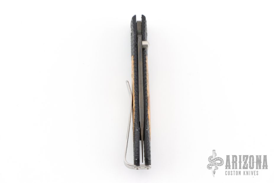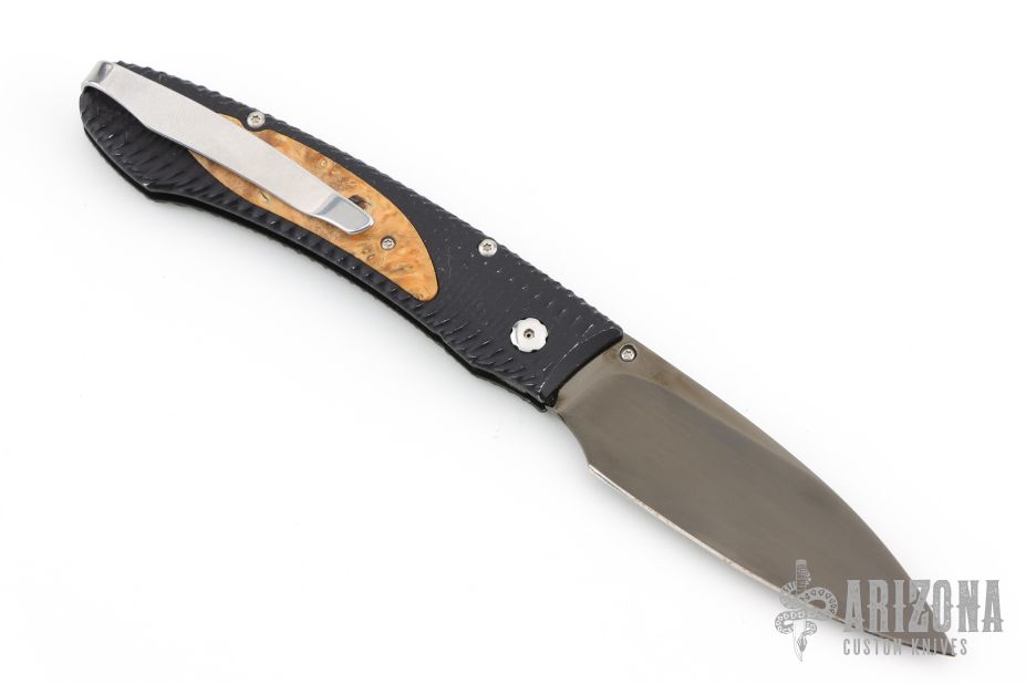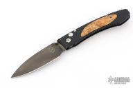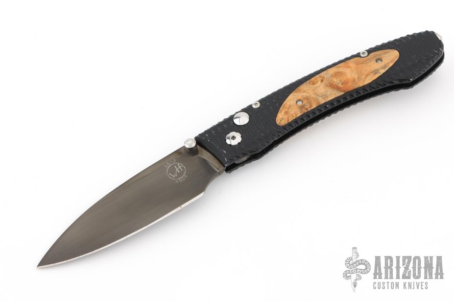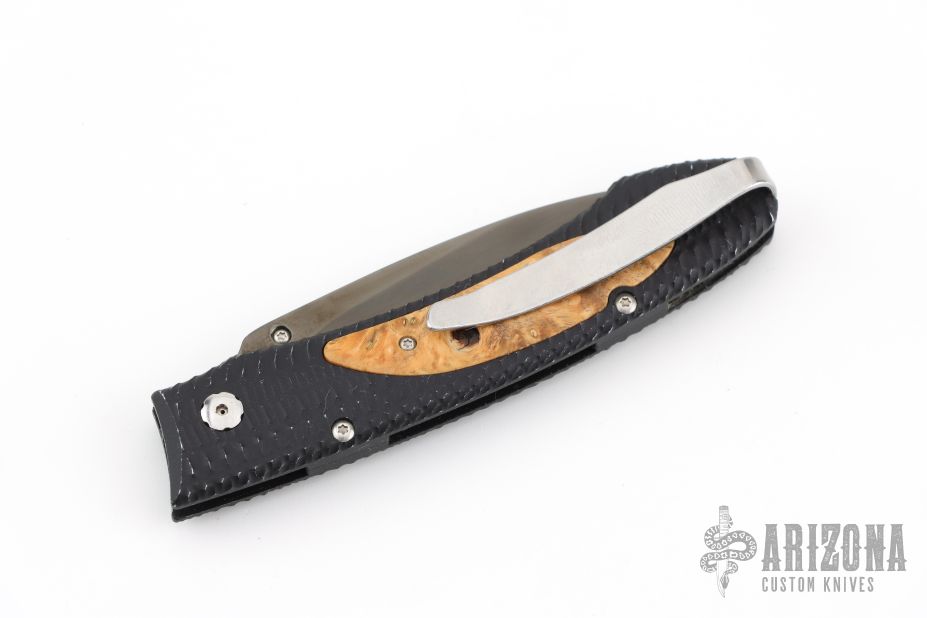 This E6-2 by William Henry features a DLC hand rub satin finished blade with single thumbstud. The handle has a black aluminum frame with box elder inlays and tip up clip. Comes with original box. Has scuffs and scratches, great condition otherwise.