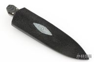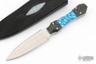 This knife by Jim Ort features a satin finished double blade with .156" blade stock and 1.042" blade depth, full tang construction. The handle has black linen micarta bolsters, Turquoise scales with nickel silver pins. Comes with a black leather sheath with stingray skin overlay. New from maker.