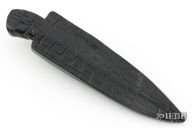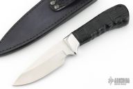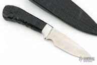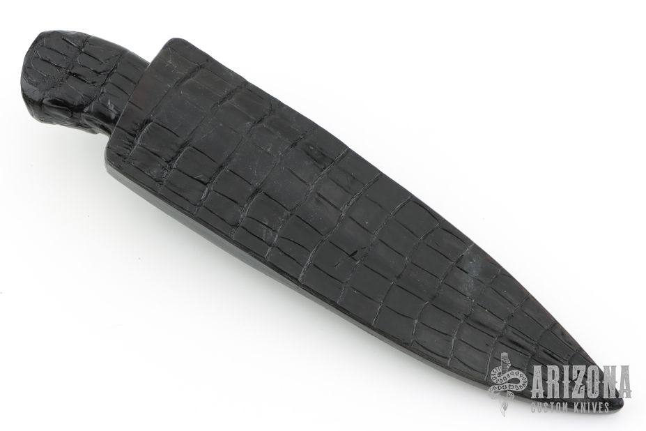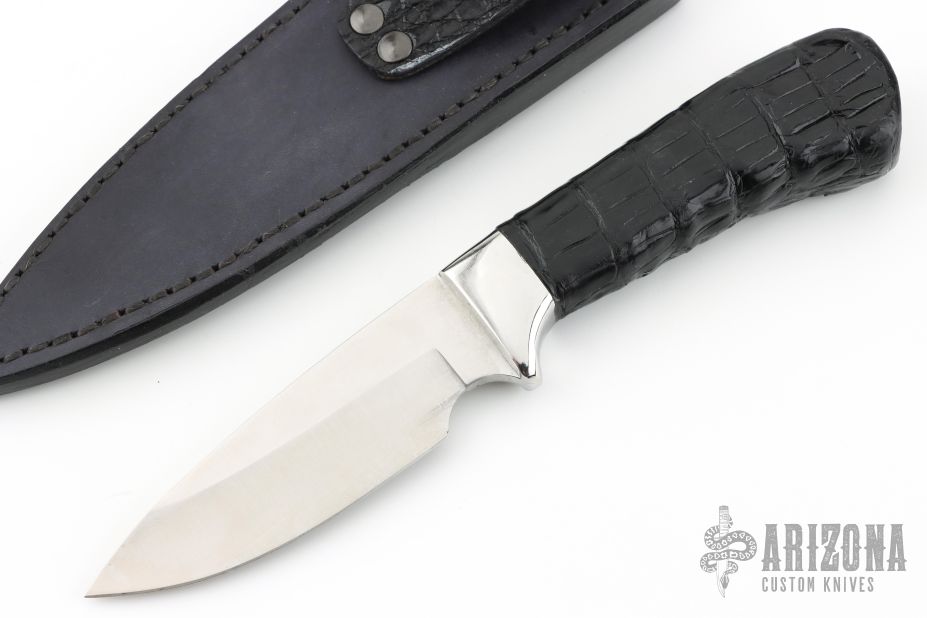 This fixed blade by Jim Ort features a satin finished blade with .188" blade stock and 1.401" blade depth, hidden tang construction. The handle has stainless steel bolsters, and crocodile leather grip. Comes with a black leather sheath with crocodile skin overlay. New from maker.