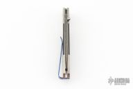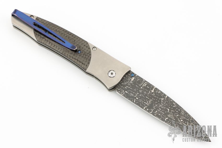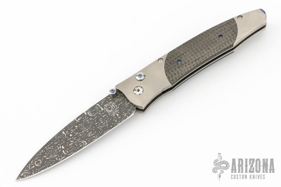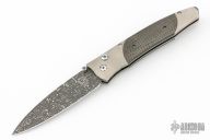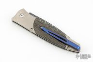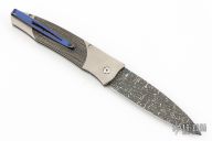 This GenTac button lock folder features a stainless ''Dot Matrix'' Damascus blade by Devin Thomas and titanium frame with carbon fiber inlays. Sapphires inset in thumb stud and push button. Blue anodized titanium scale screws. This model won Blade Magazine's 2006 "Overall Knife of the Year" award. Excellent condition. Serial # 7GM-0702 Blade Steel: Stainless 'Dot Matrix' Damascus - Devin Thomas