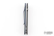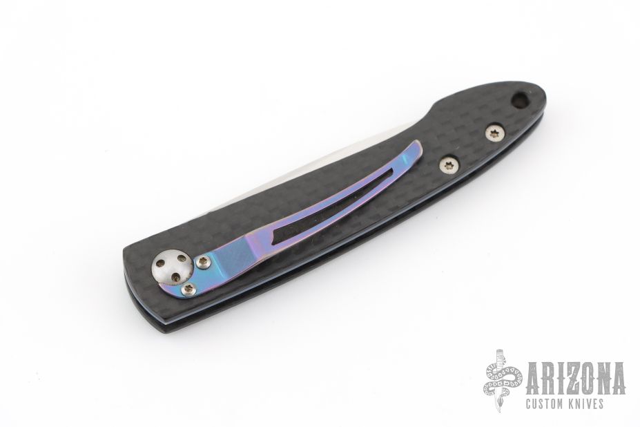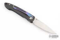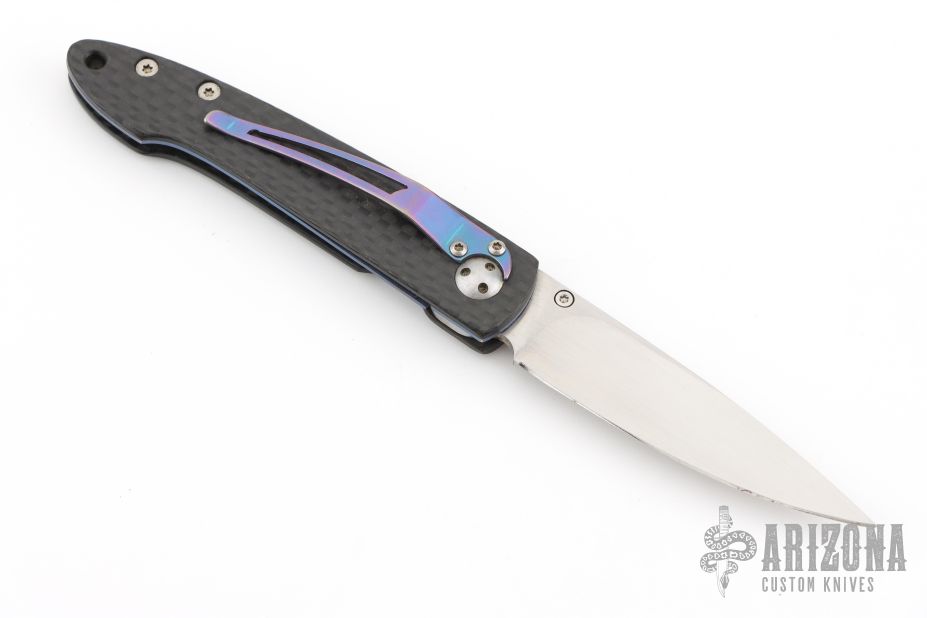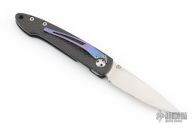 This Lancet linerlock folder features a satin blade and carbon fiber frame. Anodized titanium clip. Includes original box and papers. Excellent condition. Blade Steel: ATS34