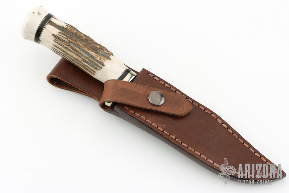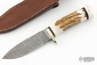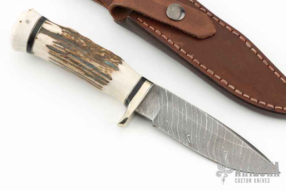 This knife by Jim Ort features a Damascus blade with false top edge, .158" blade stock and 1.191" blade depth, hidden tang construction. The handle has a nickel silver guard, stag grip and butt, black linen micarta and nickel silver spacers. Comes with a brown leather sheath. New from maker.
