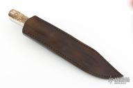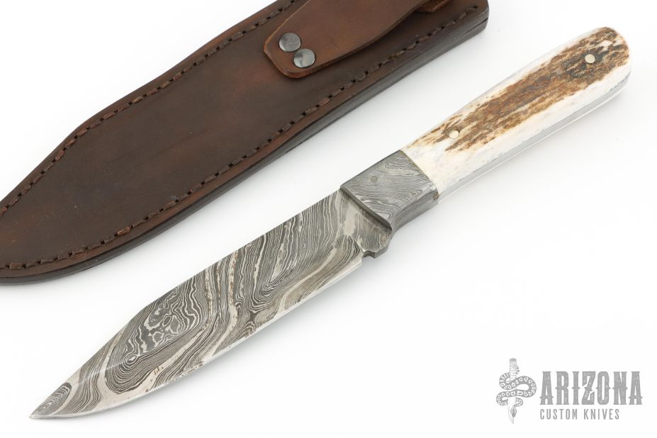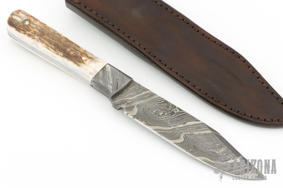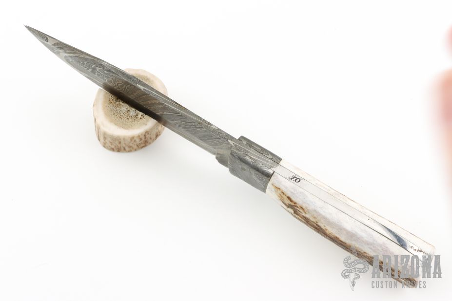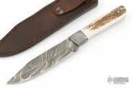 This knife by Jim Ort features a Damascus blade with false top edge, .194" blade stock and 1.311" blade depth, full tang construction. The handle has Damascus bolsters, stag scales and nickel silver pins. Comes with a brown leather sheath. New from maker.