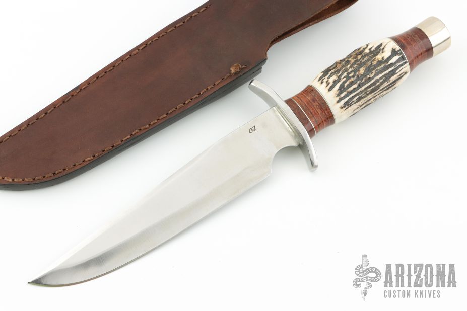This Bowie by Jim Ort features a satin finished blade with a false top edge, .174" blade stock and 1.440" blade depth, hidden tang construction. The handle has a stainless steel guard, nickel silver butt, stag grip with stacked leather and nickel silver spacers. Comes with a brown leather sheath. New from maker.