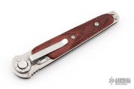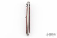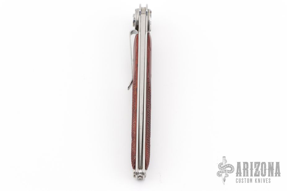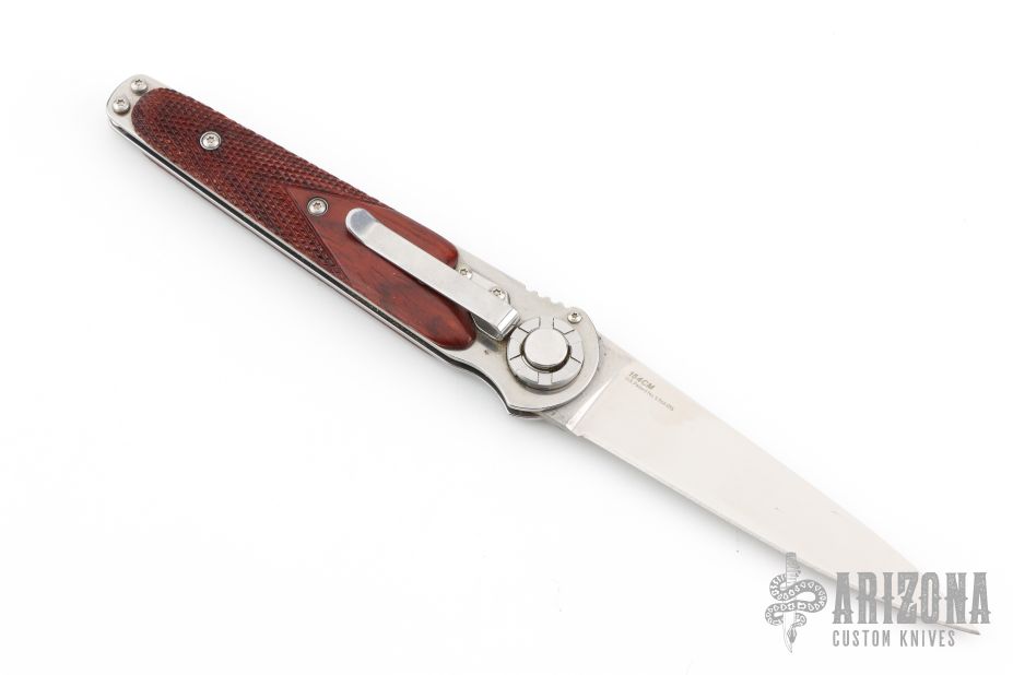 This knife by Benchmade has an axial locking mechanism. It features a satin finished drop point blade, with thumb ramp. The handle has checkered wood scales with a stainless steel frame and tip down clip. Has some light scratches, excellent condition otherwise.
