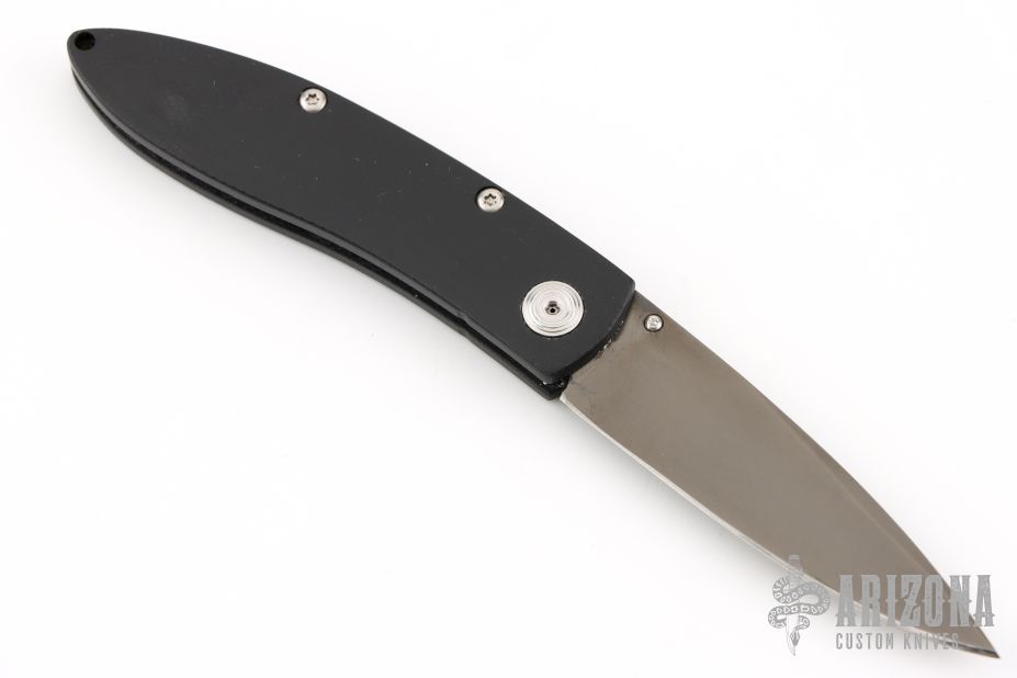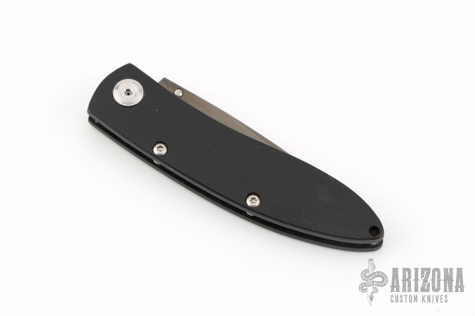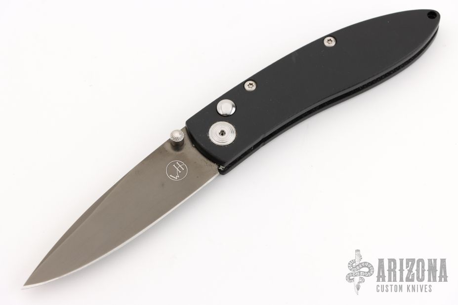 This William Henry knife features a black blade with single thumbstud, stainless fittings, G10 frame, and titanium standoffs. Comes with a leather pocket sheath with clip. Has some light scuffs, excellent condition.