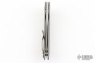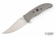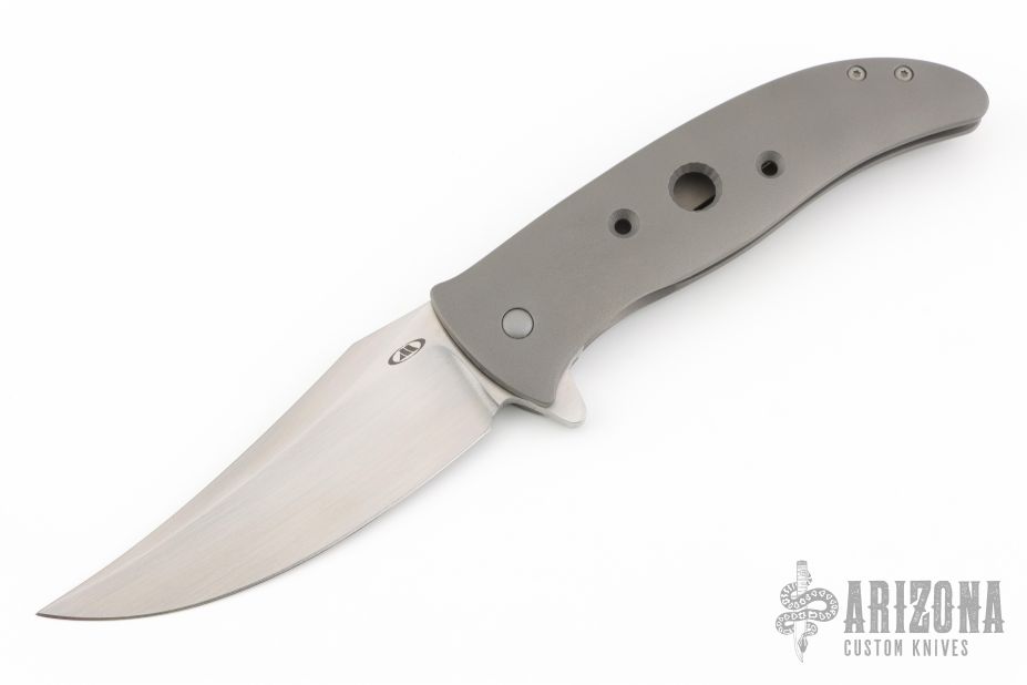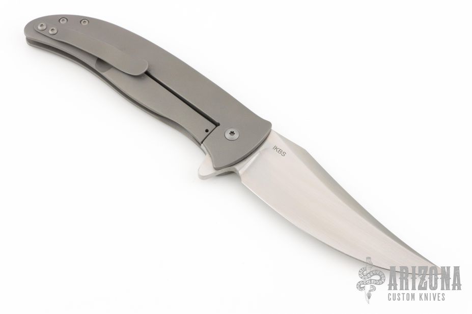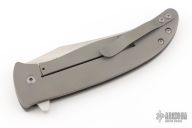 This Persian flipper by Tom Mayo features a hand rub satin finished upswept blade with a false top edge and flipper. The handle has a drilled and bead blasted titanium frame. Titanium clip, tip up carry. Smooth action. Nice blade seating, detent and lockup. Rides on IKBS. Excellent work. Comes with a zippered case. Excellent condition.