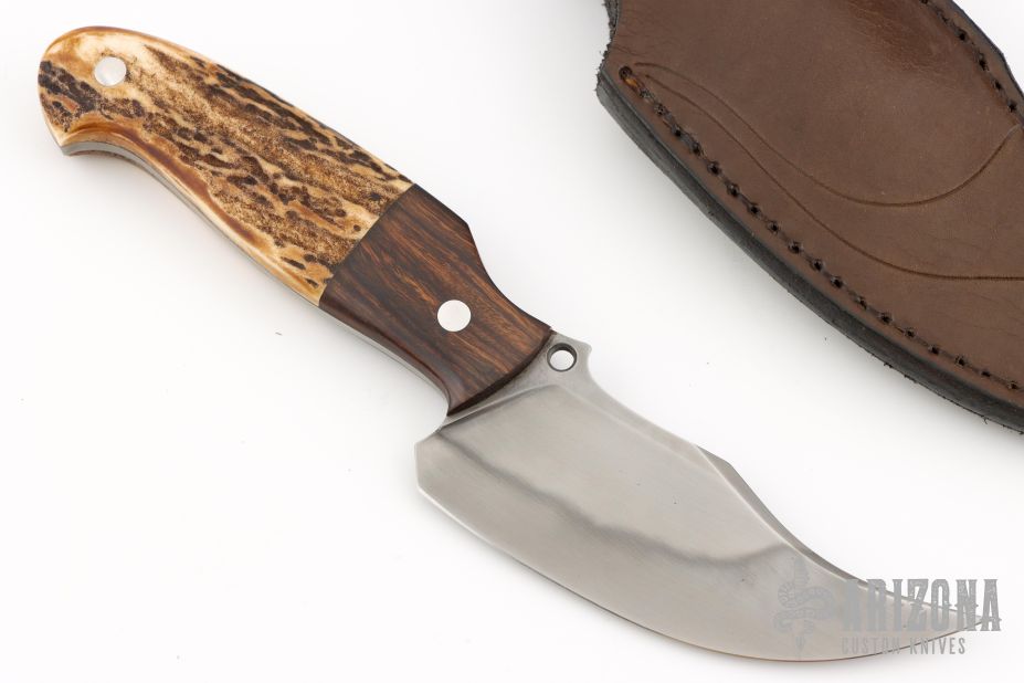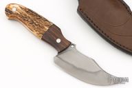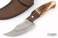 This Skinner by Mariano Yannoni features a hand rub satin finished blade with nice hamon and false top edge, .131" blade stock and 1.669" blade depth, full tang construction. The handle has desert ironwood bolsters and stag scales. Comes with a brown leather sheath and maker's soft case. Has a couple small spots on the blade, otherwise excellent condition.