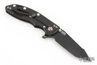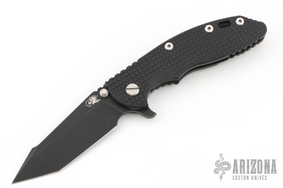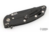 This 3.5" XM-18 from Rick Hinderer features a Battle Black finished blade with notched thumbrest and flipper. Frag pattern black G-10 scale and battle black titanium frame and pocket clip. Dual thumb studs and notched thumb rest. Reversible pocket clip. Strong lock up, nice detent and blade seating is center. Includes original box, extra hardware and papers. Excellent condition.