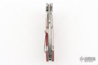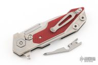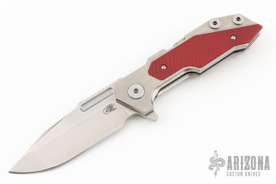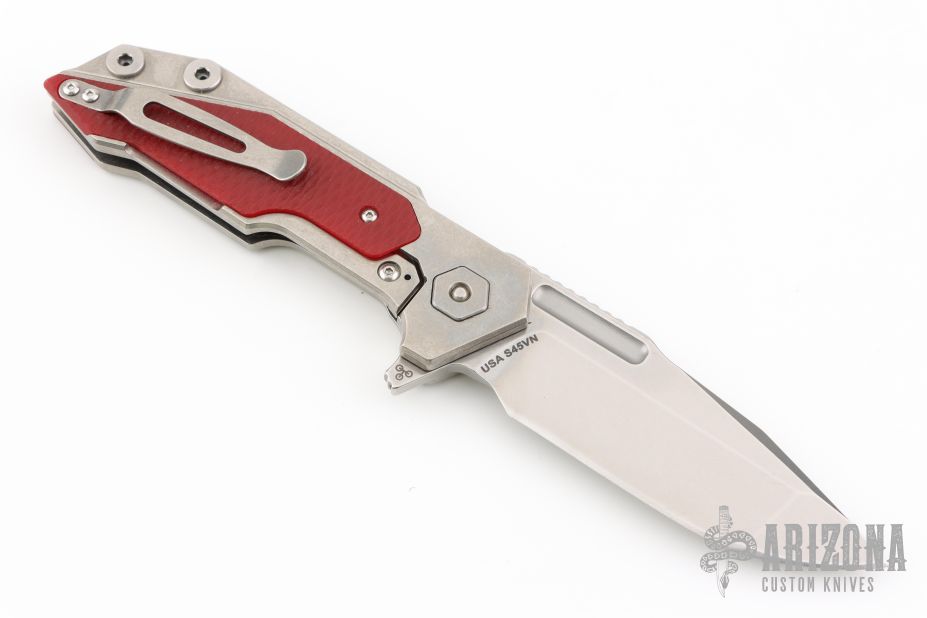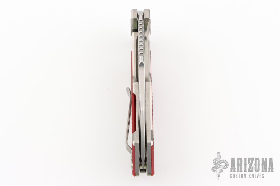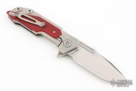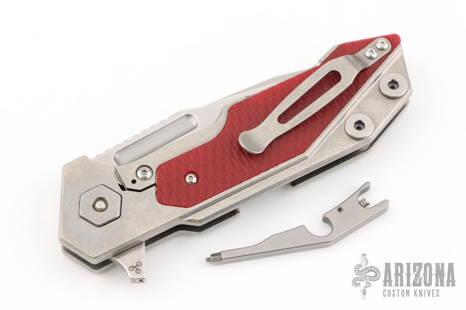 This Fulltrack flipper from Rick Hinderer Knives was just released at the 2018 Blade Show and this is the quite possibly the coolest design we've seen since the XM-18! This one features a stonewash finished blade with notched thumbrest and flipper. The handle is stonewash finished titanium with red G-10 scales that can be removed to reveal a hidden pocket/storage area that was designed to hold additional pivot washers. This entire knife can be field stripped using a tool that rests between the handle scales. The tool has a spring that holds the tool between the standoffs.  Come with Tri-Pivot system.  Comes with origianl box and extra hardware. Excellent condition.