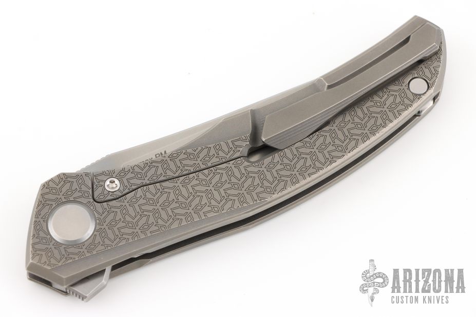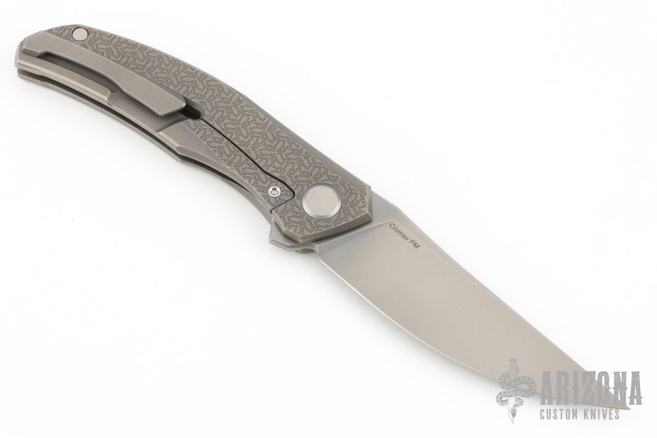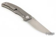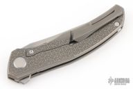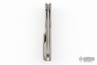 This Quantum R1P by Shirogorov features a stonewashed Cromax PM blade with notched thumbrest and flipper. The handle has a tumbled and milled titanium frame, backspacer, tip up titanium clip with hidden screws. Rides on SRB, nice detent, lockup and blade seating. Comes with original box and COA. Excellent condition.