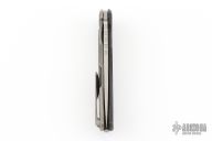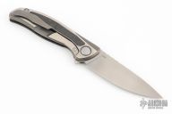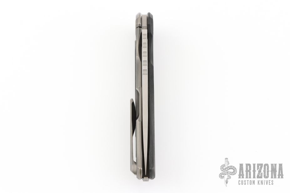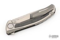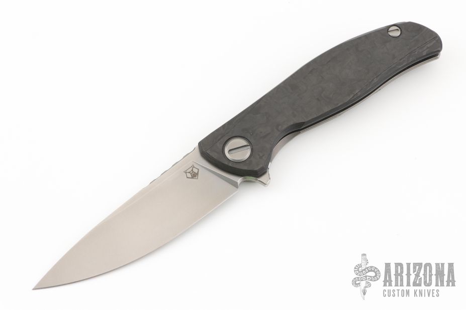 This Hati Gen3 by Shirogorov Knives features a drop point blade with notched thumbrest and flipper. The handle has marble carbon fiber and titanium frame with marble carbon fiber inlay, titanium tip up clip with hidden screws, titanium backspacer with lanyard hole. Rides on bearings, nice detent, lockup and blade seating. Comes with original box, cloth and COA. Excellent condition.
