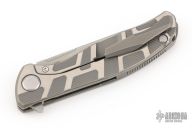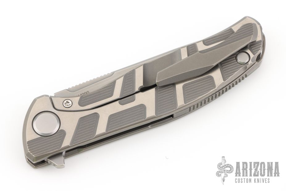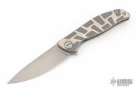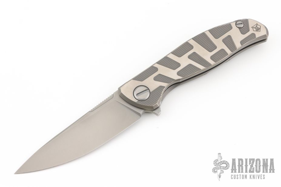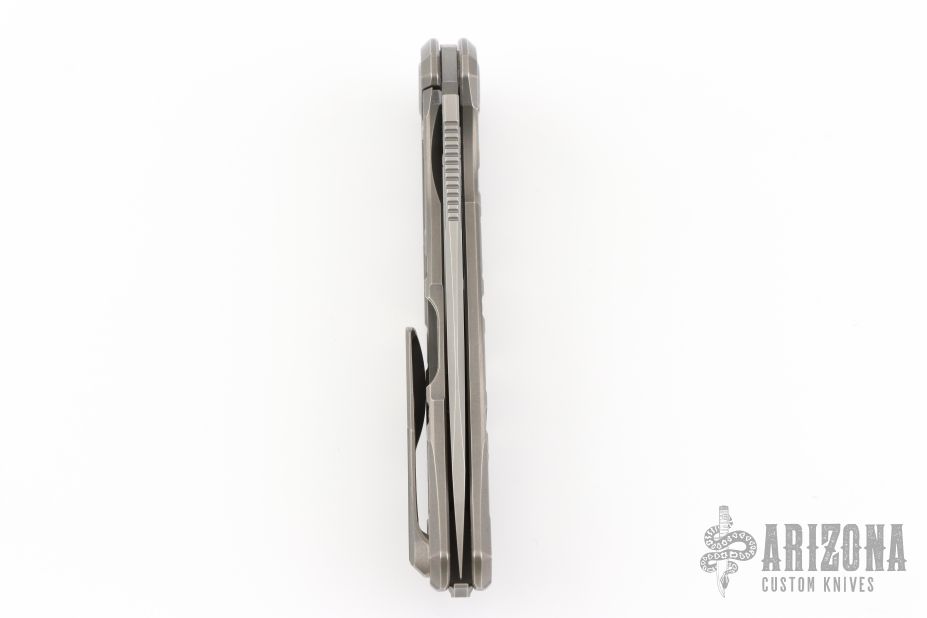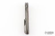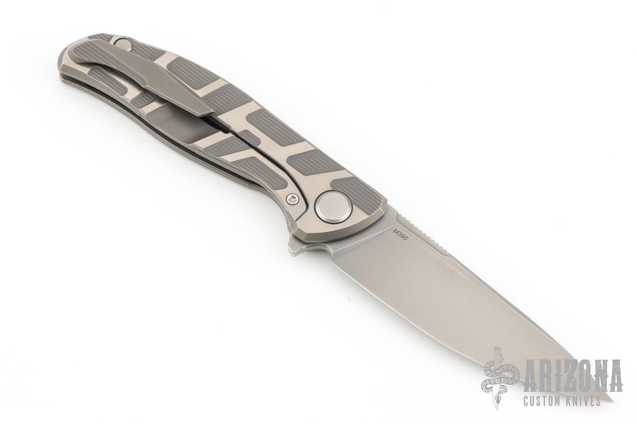 This F95T by Shirogorov Knives features a stonewashed blade with a notched thumbrest and flipper. The handle has a two-tone milled titanium frame with matching titanium backspacer and tip up clip. Nice detent, lockup and blade seating. Has MRBS. Comes with original box, cloth, and COA. Excellent condition.