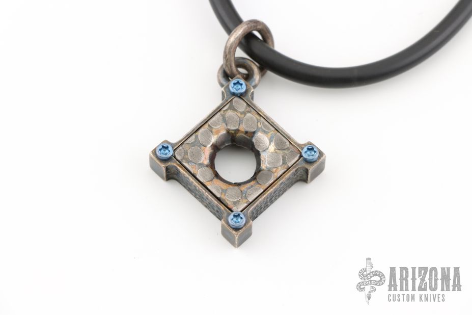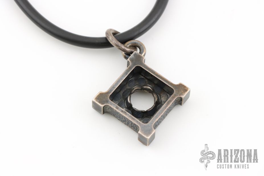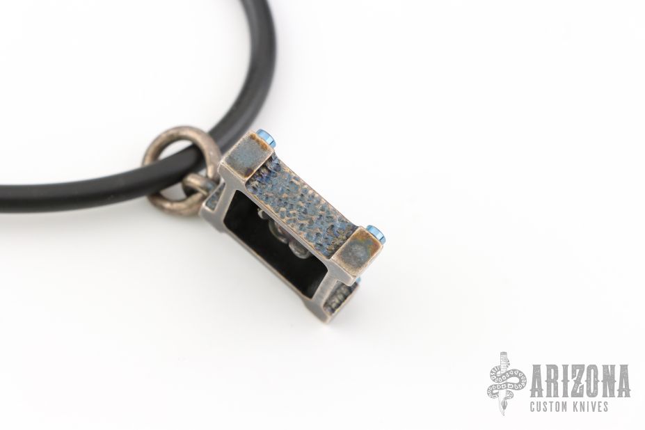 This Super Conductor Killbox by Steel Flame features an antiqued silver frame with super conductor inlay with a 300 Blackout bullet hole. Has some light scratches, otherwise excellent condition. Comes with COA dated 1/26/15. Comes with a rubber necklace.
