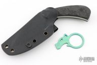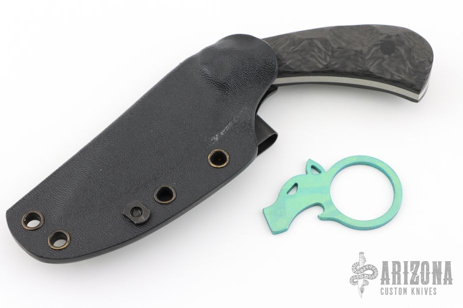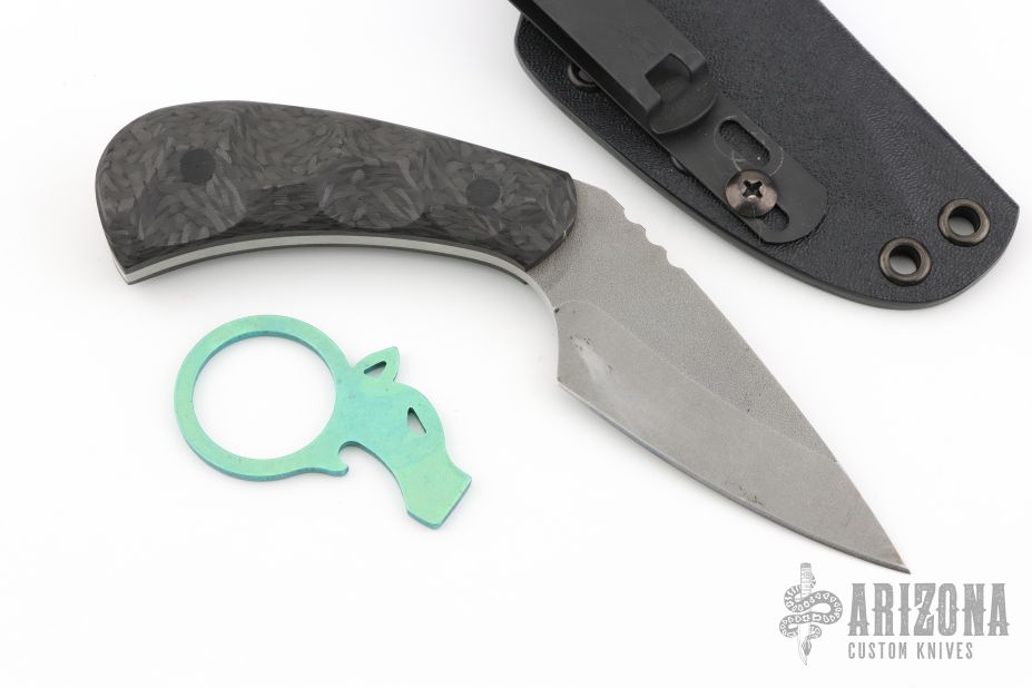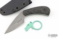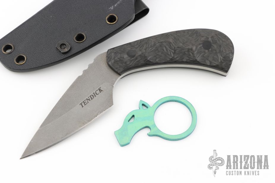 This Push Dagger by Ben Tendick features a tumble finished drop point blade with notched thumbrest, .148" blade stock and 1.240" blade depth, full tang construction. The handle has sculpted carbon fiber scales with black pins. Comes with a kydex sheath. Has some sheath scuffs, otherwise good condition. Comes with makers card. Comes with anodized titanium bottle open as well.