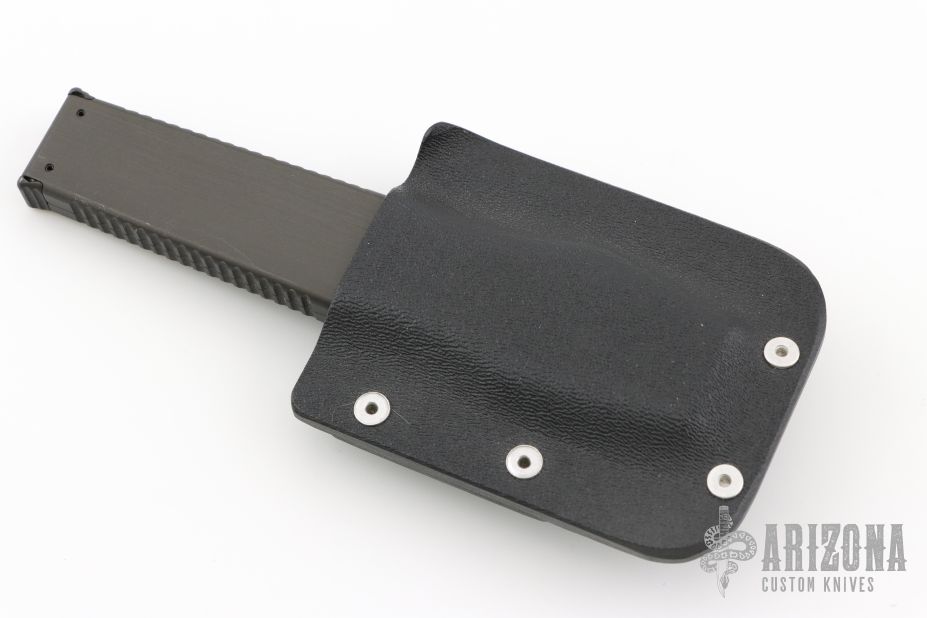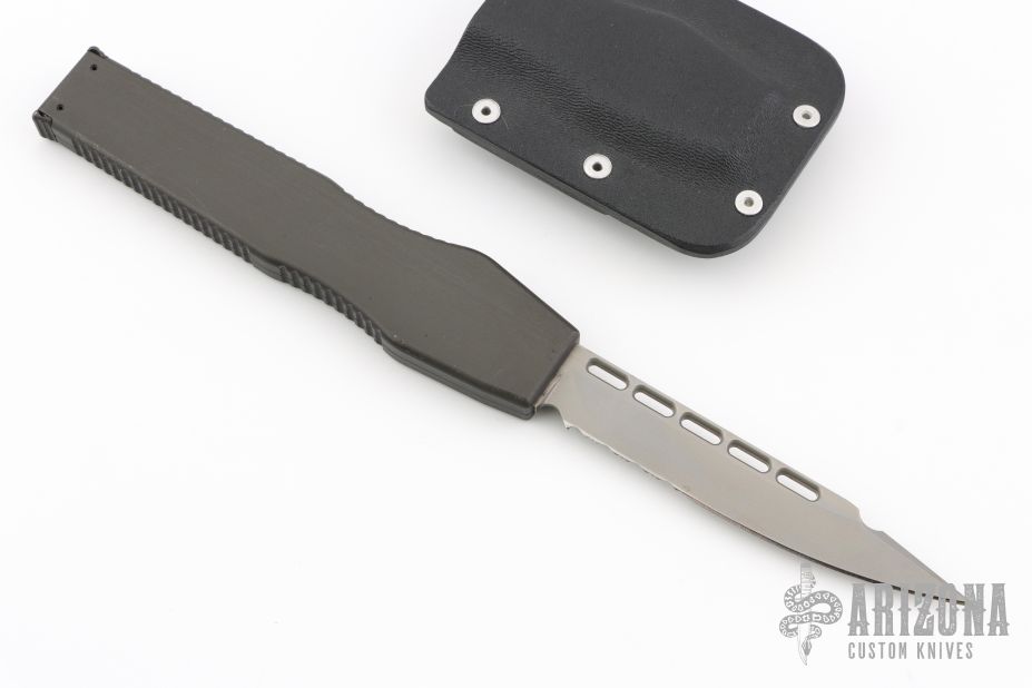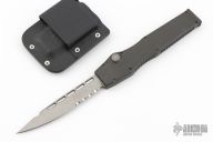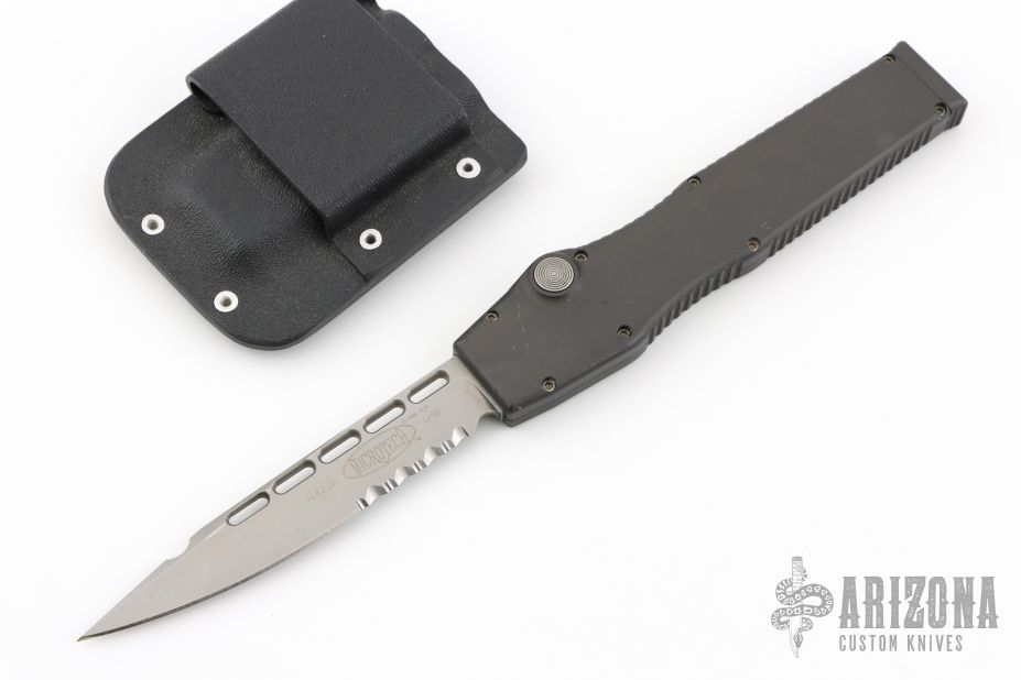 This HALO II is the clip point blade model in the HALO series by Microtech Knives. Single action, side positioned button for firing. Closure via a reverse charging handle in the rear of the frame. Contoured frame grip with milled ribbing on the frame spine and belly. This Halo II has a bead blasted clip point partially serrated blade. Dated 03/98. Has some scuffs, otherwise excellent condition. Comes with original kydex sheath.