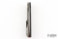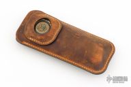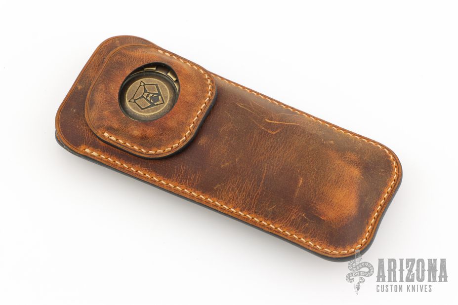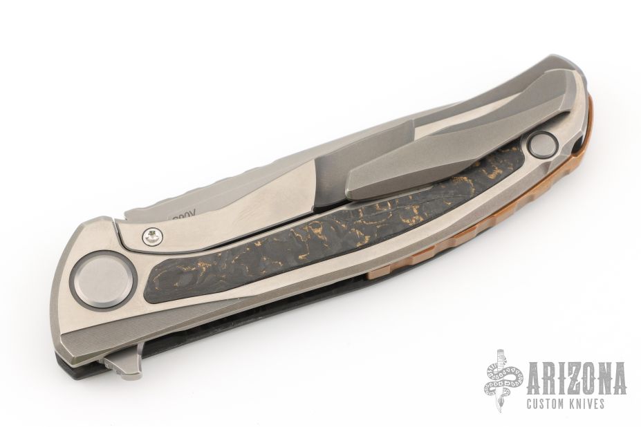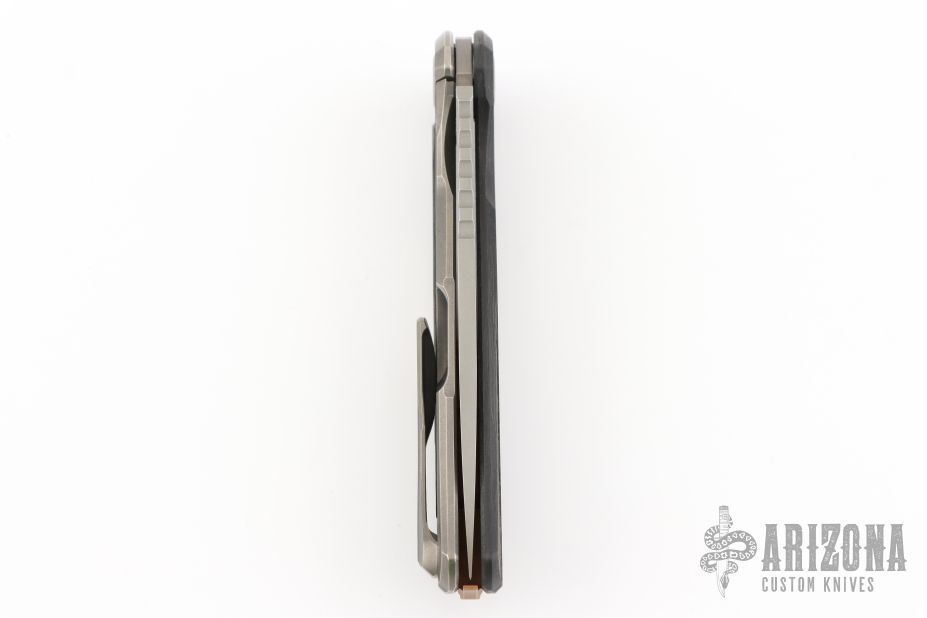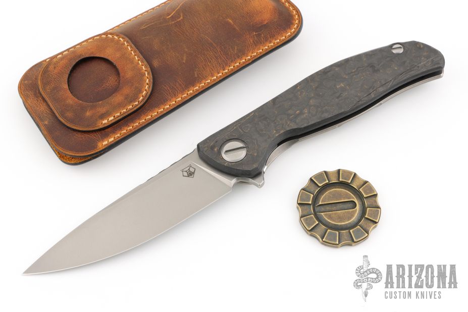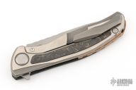 This Hati CCKS-Spring Edition by Shirogorov Knives features a stonewashed blade with notched thumbrest and flipper. The handle has a bronze marble carbon fiber and stonewashed titanium frame with matching tip up clip, bronze backspacer with lanyard hole. Rides on bearings, nice detent, lockup and blade seating. Comes with COA #34, Cova Leather Pouch, and a HiTex Antique Bronze Shirogorov Chip with original box. Excellent condition.