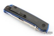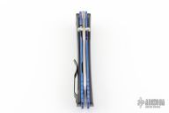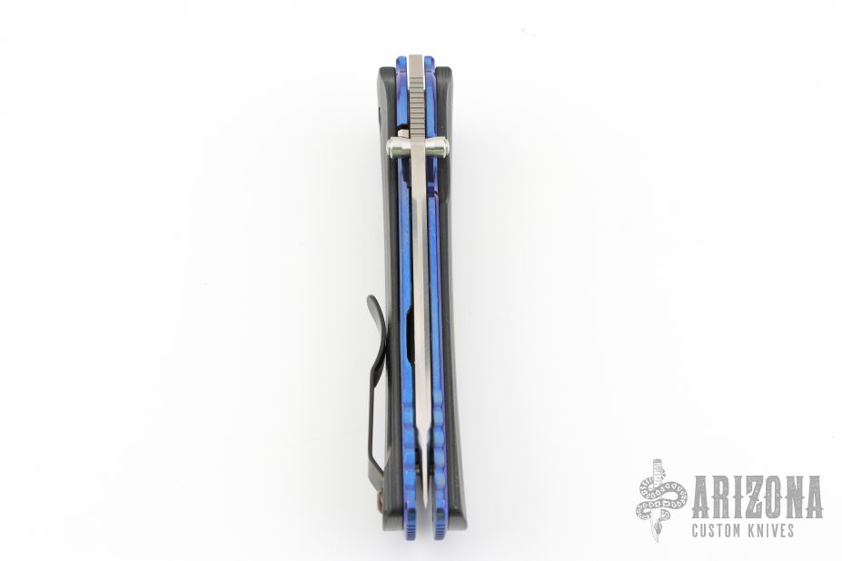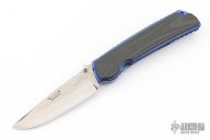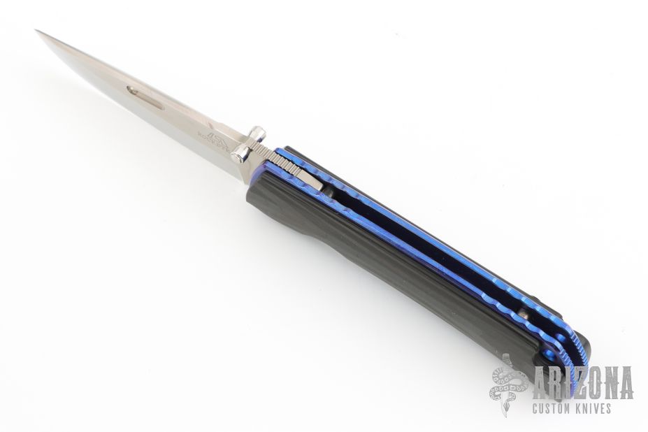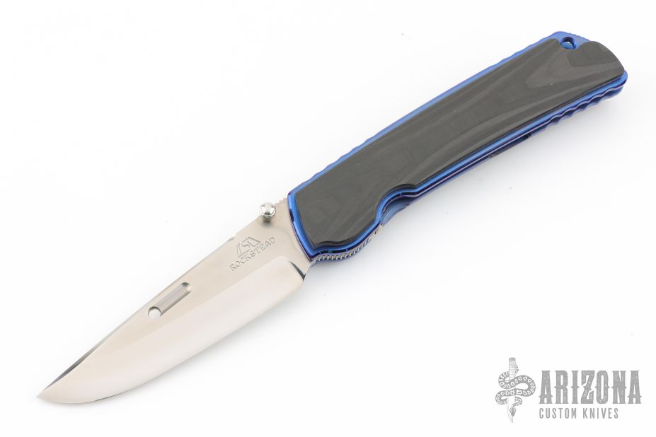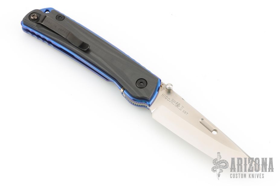This Higo from Rockstead features a two-tone drop point blade with mirror polished grinds, dual thumb studs and notched thumbrest. The handle is comprised of carbon fiber scales over anodized titanium liners and a single barrel spacer. Lanyard hole in pommel. Includes original box and papers.  Excellent condition.