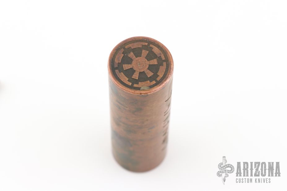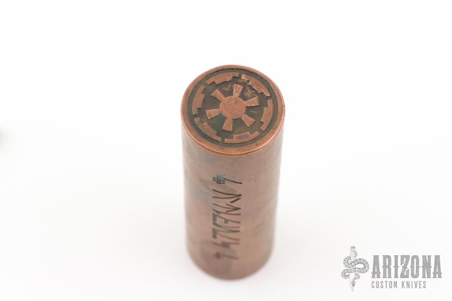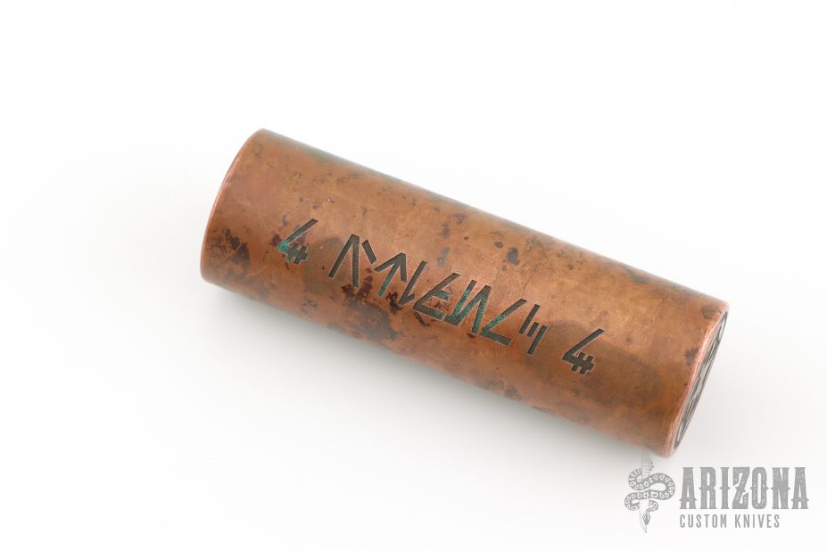 Fist Full of Credits by Ben Tendick. 1" diameter copper bar with laser engraving. Has a forced patina. Has a couple light scratches, otherwise excellent condition.