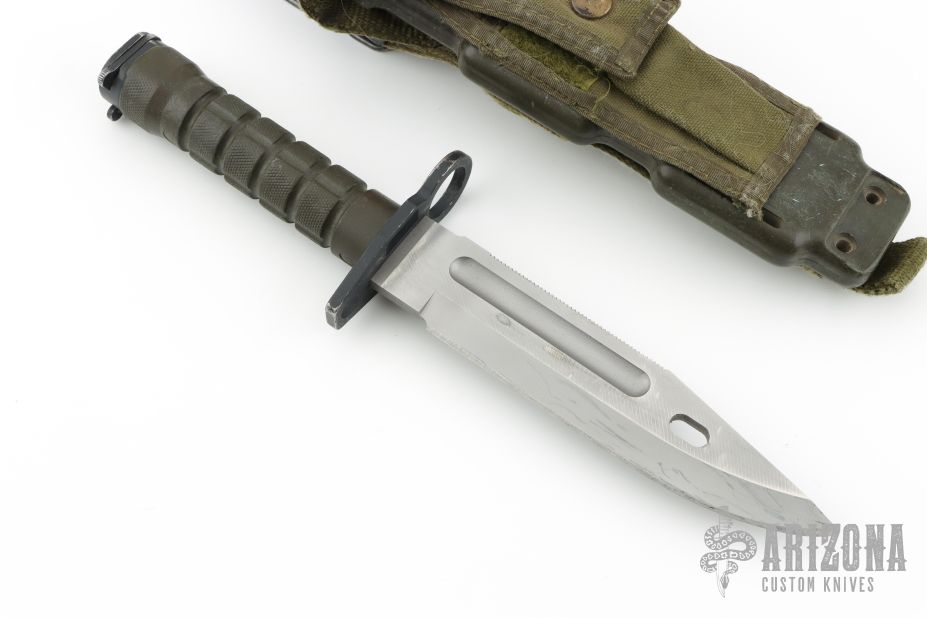This M9 Phrobis III features a bead blasted spear point blade with sawteeth on the spine and a large fuller, .234" blade stock and 1.434" blade depth, hidden tang construction. The handle has a black steel guard and green plastic grip and can be removed from the handle for cleaning. Comes with original sheath. Has scratches and scuffs, otherwise good condition. "Ho-45" scratches into the blade.