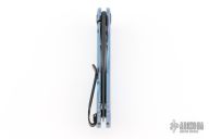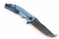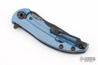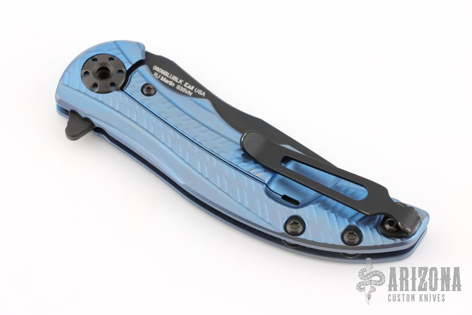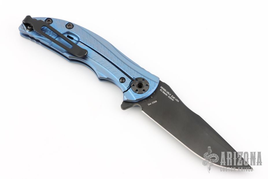 This 0609 RJ Martin flipper by Zero Tolerance features a black blade with notched thumbrest and flipper. The handle has a milled and anodized titanium frame with a tip up Deep Carry MXG reversible stainless steel clip. Rides on bearings, nice detent, lockup and blade seating. Comes with original box and clip. S/N 0306. Has some scuffs and scratches, great condition otherwise.