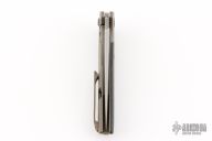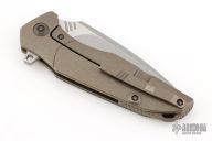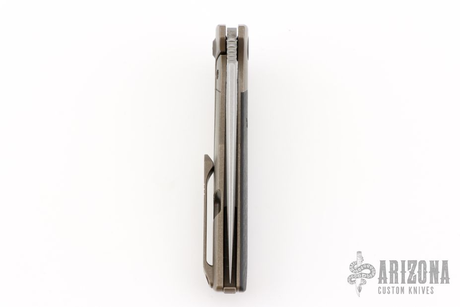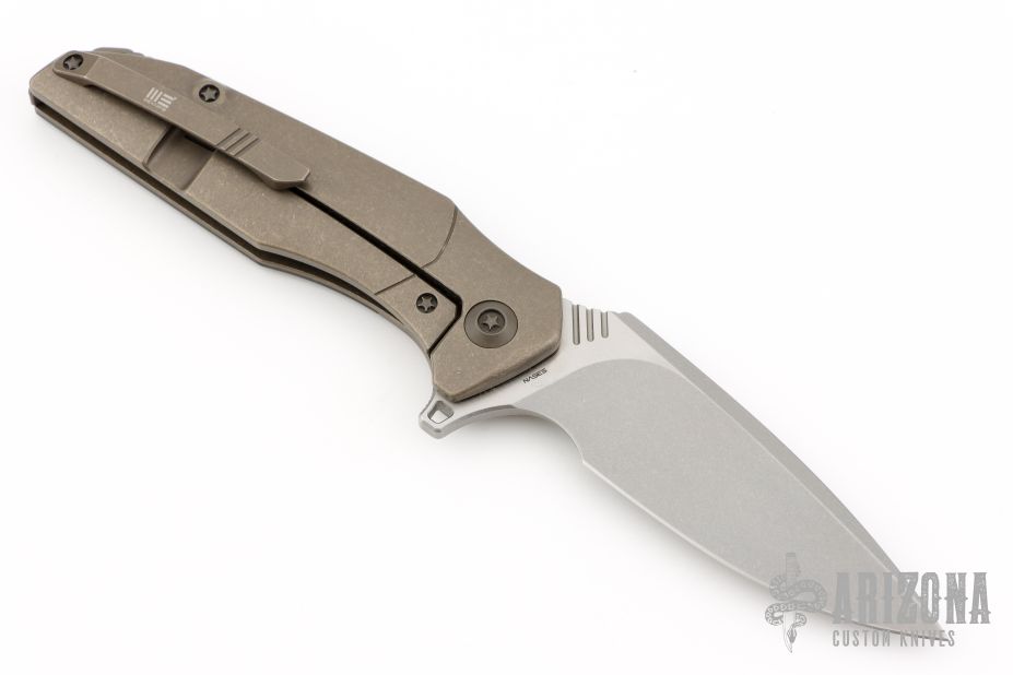 This Nitida Flipper by WE Knife Company features a two-tone spear point blade with swedge, notched thumb ramp and flipper. The handle is comprised of a tumbled and anodized titanium frame with carbon fiber overlays, matching tip up clip and backspacer with lanyard bail. Great blade seating, detent and lock up. Flips well on bearings. Comes with original box, papers, and zipper case. Excellent condition.