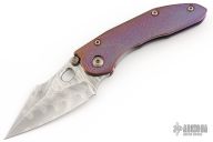 This Stitch by Borka Blades features a clip point Chad Nichols San Mai Damascus blade with swedge, thumb hole and dual thumb studs/blade stops. The handle has an orange peel finished and anodized titanium frame with a titanium tip up clip over titanium barrel spacers. Includes zippered case. Excellent condition.