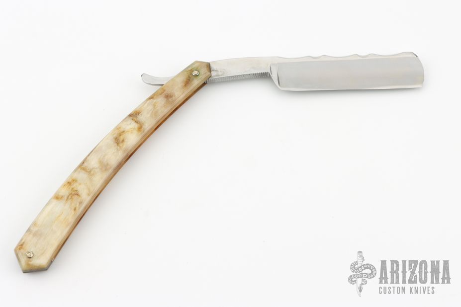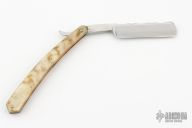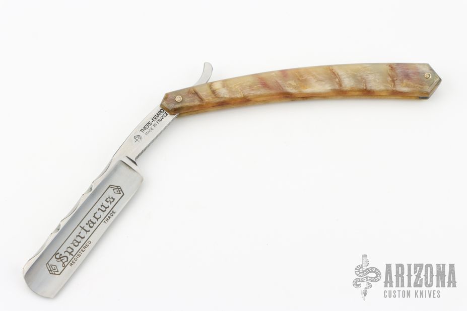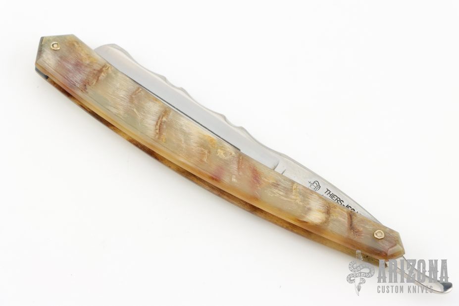This 6/8 Straight Razor by Thiers Issard features a hollow ground blade with notched finger rest, rams horn handle. Comes with original sheath, box and papers. Has some light patina and scratches, great condition otherwise.