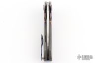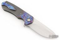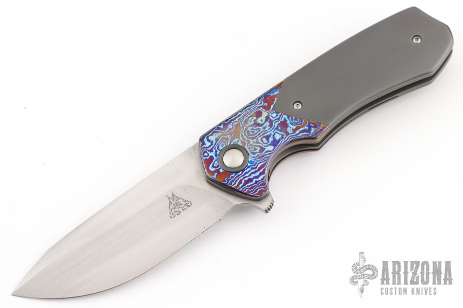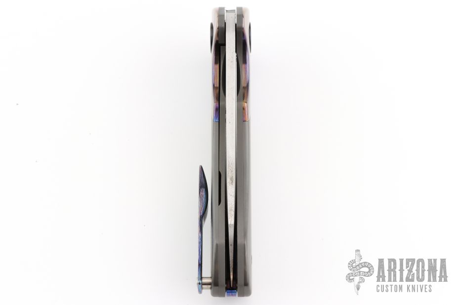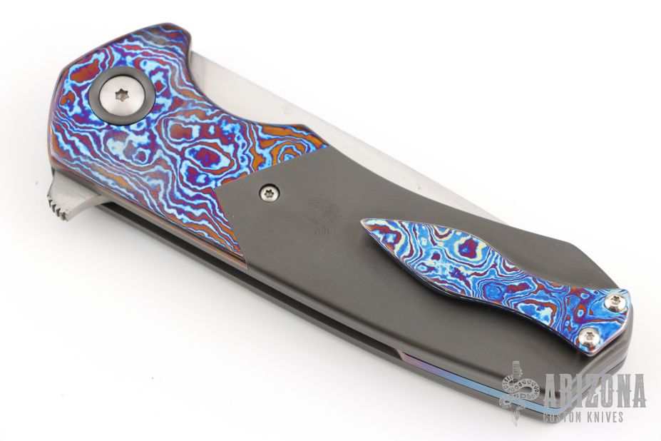 This Typhos flipper by Walter Randolph features a hand rubbed satin finished blade with nice hamon, false top edge, notched flipper. The handle has MokuTi bolsters with zirconium pivot collars, zirconium scales, bead blasted titanium liners, floating MokuTi backspacer, and a MokuTi tip up clip. Nice detent, lockup and blade seating. Rides on bearings. Has a couple very small spots on the blade, otherwise excellent condition. Comes with a zippered case.