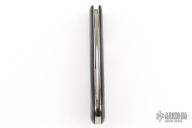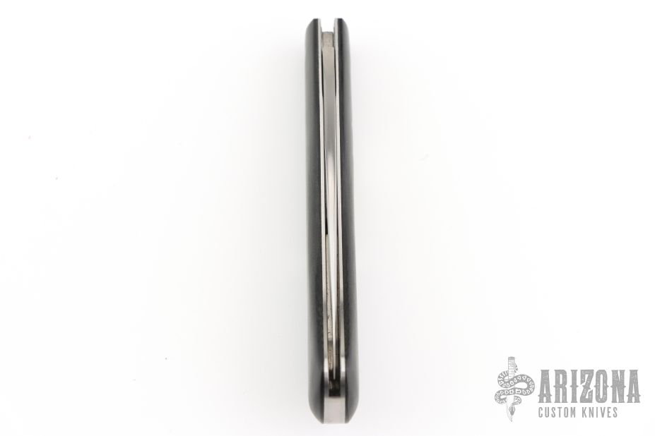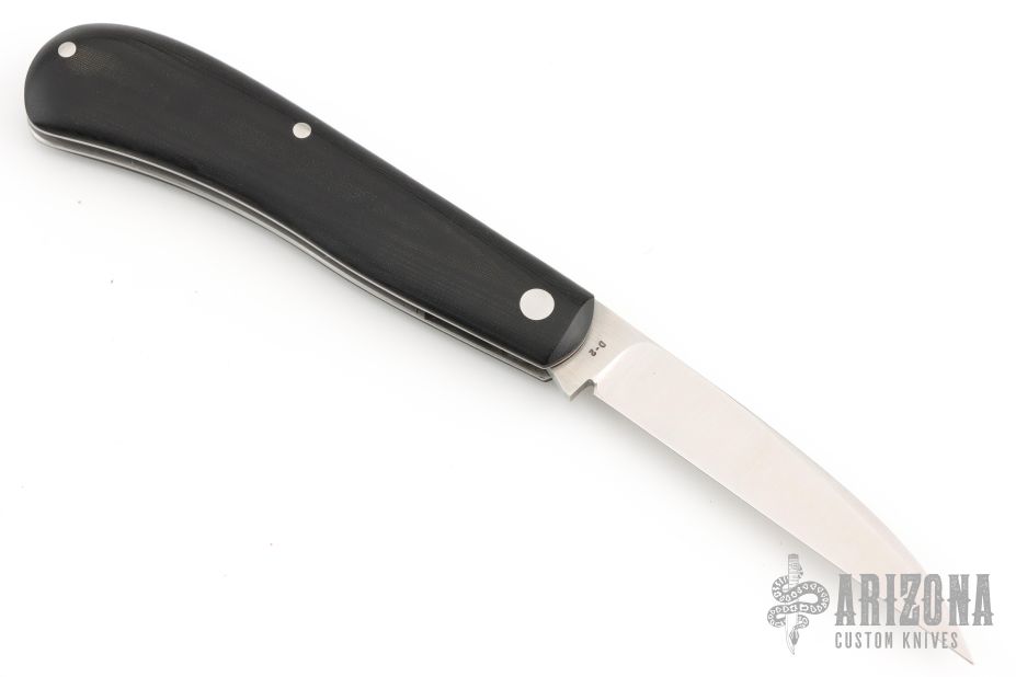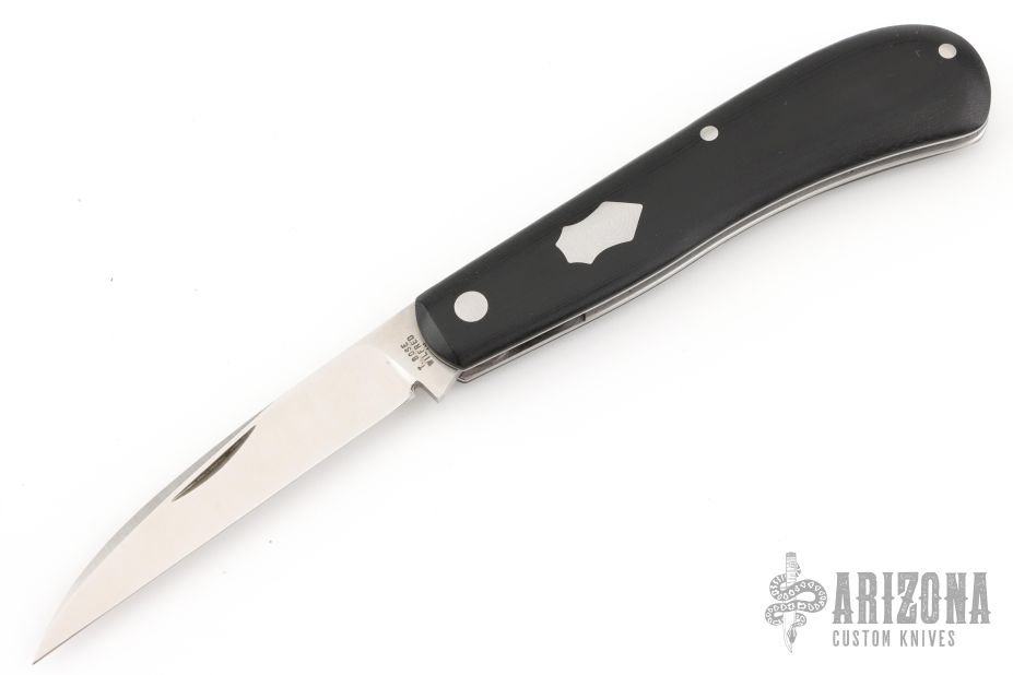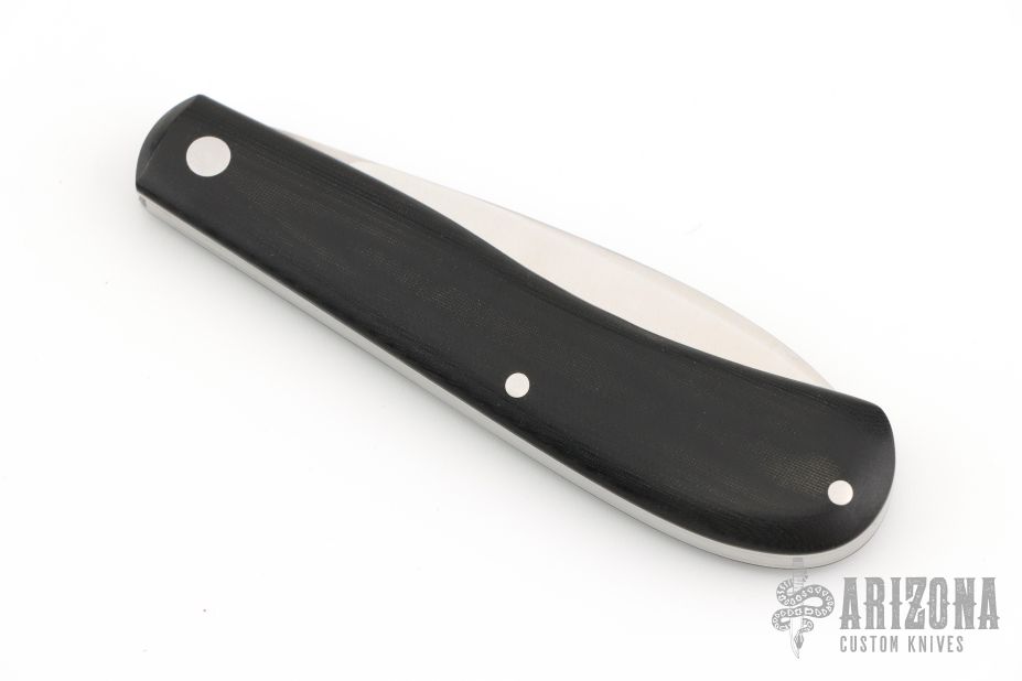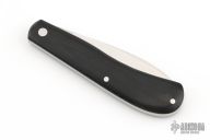 This slip joint knife from Tony Bose features a hand rub satin finished blade with nail nick. Half stop blade positioning and opens with a snap, flush in all positions. The handle has black linen micarta covers, stainless steel escutcheon, stainless liners and spring. Excellent condition.
