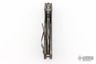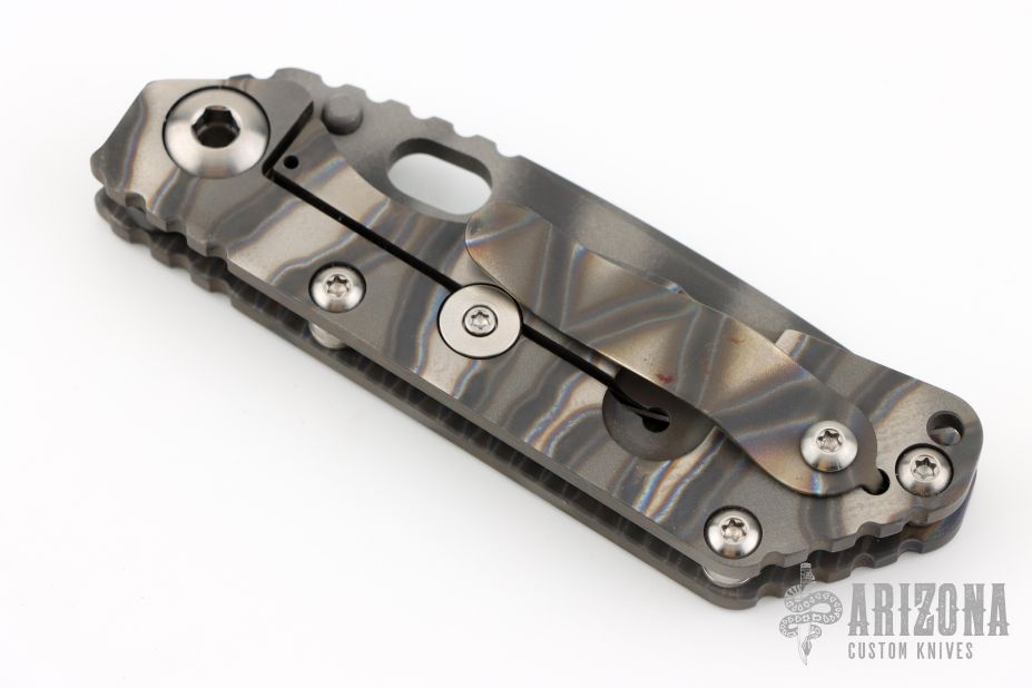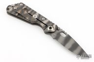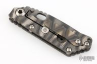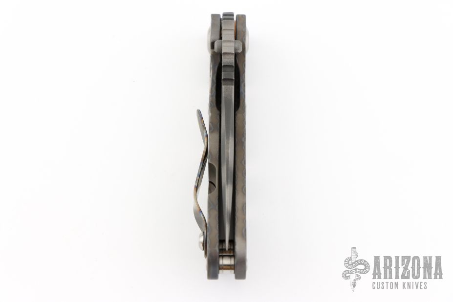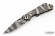 This JVA by Mick Strider is larger than a PT, but smaller than an SNG. It features a tiger striped blade with notched thumbrest and thumbhole. The handle has a Disruptive Strider Stripe finished titanium frame with matching tip up clip. Has a couple light scuffs and scratches, excellent condition otherwise.