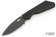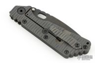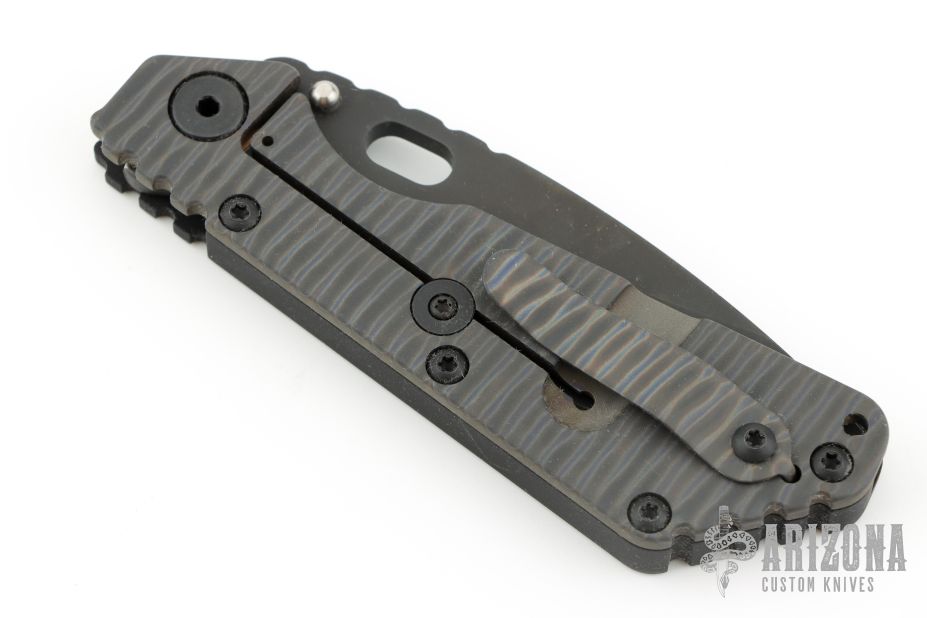 This Mick Strider SMF framelock folder features a black blade with thumbhole and notched thumbrest. The handle has a black aluminum and flamed titanium frame with titanium clip, tip up carry. Jimping on blade spine. Nice lockup, detent, and blade seating. Excellent condition.