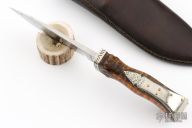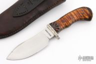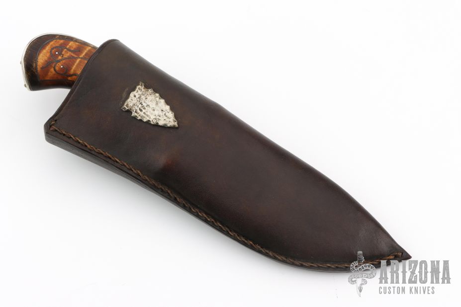 This knife by Master Smith Jay Hendrickson features a high satin finished blade with .230" blade stock and 1.525" blade depth, hidden tang construction. The handle has a fileworked nickel silver guard, curly maple grip with silver wire inlays, scalloping behind the guard, nickel silver plate pinned with brass pins to the spine of the handle, has arrowhead carving. Comes with a brown leather sheath with nickel silver arrow head overlay. Has a few light spots on the blade, otherwise excellent condition. Sheath stamped 1994.