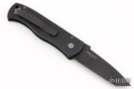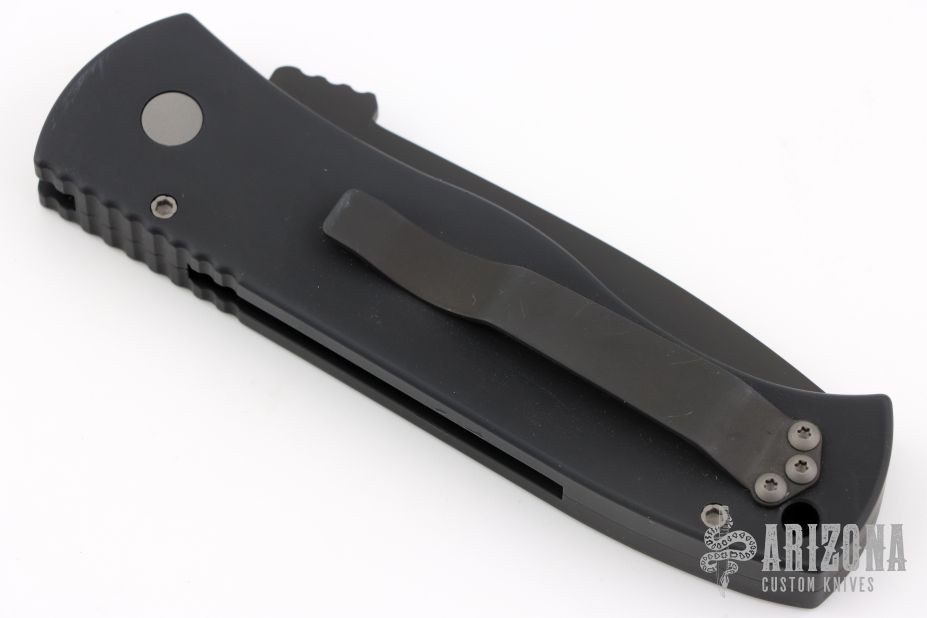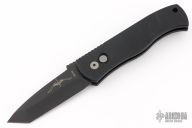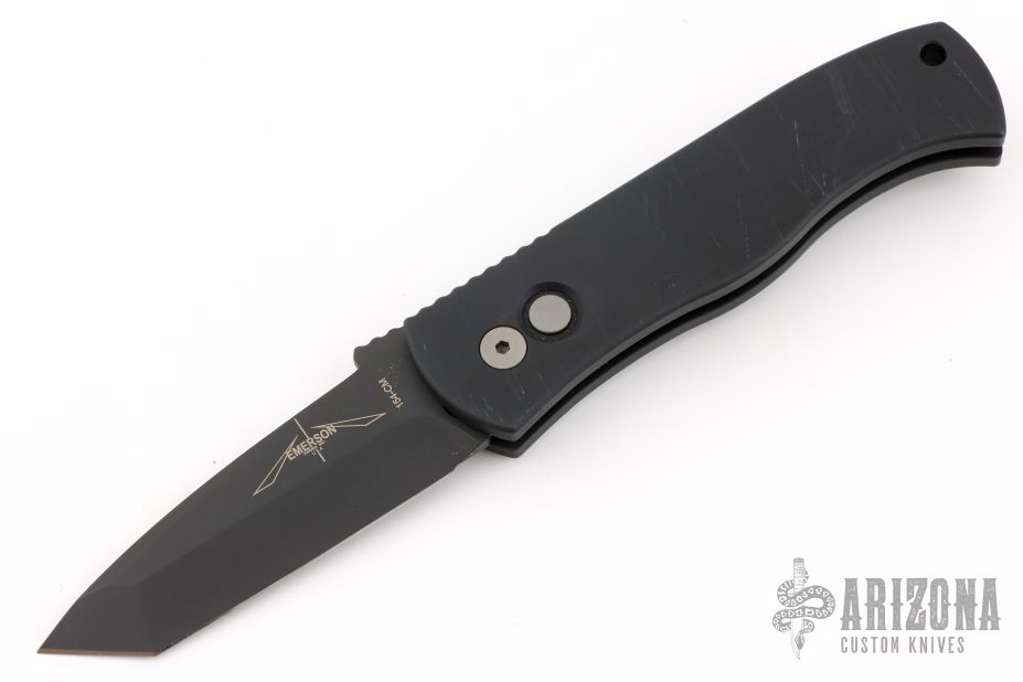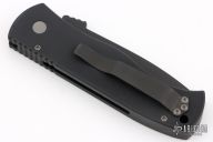 This Emerson/Pro-Tech CQC7 automatic has a chisel ground black DLC finished blade with a plain edge and a solid black aluminum handle. Coil spring. Has some scuffs, otherwise good condition. Comes with original box and papers.