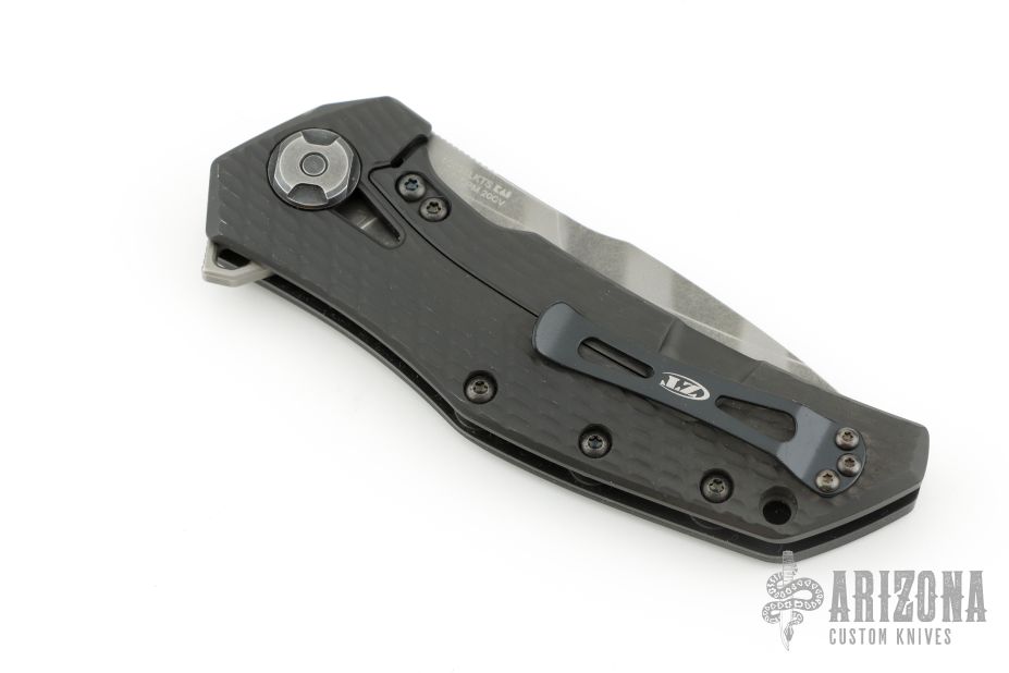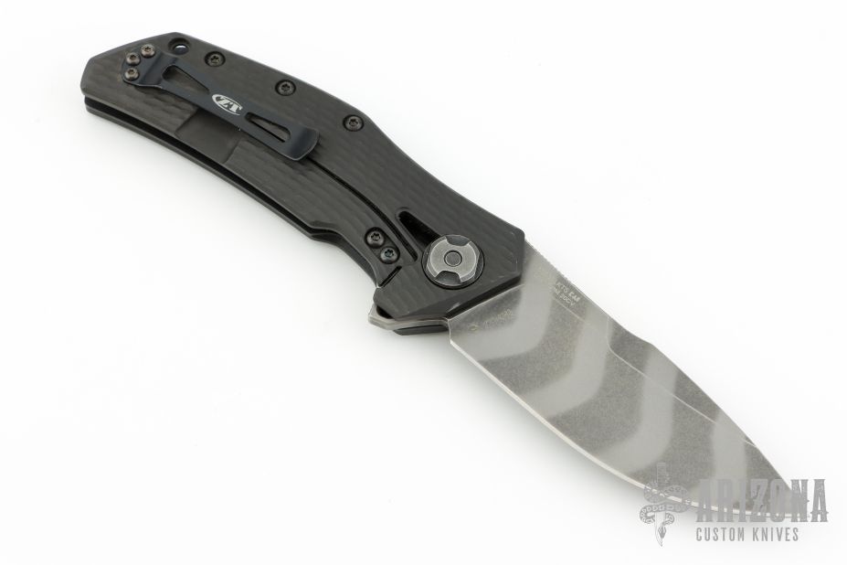 The ZT 0308BKLTS is a beefy tactical folder with everything you'd expect from a ZT going for it. It's made of a black G-10 handle with a titanium frame lock, and DLC coating. The blade is made of CPM-20CV steel with black oxide BlackWash, and is finished with tiger stripes. The handle has texture that provides a sure grip, but won't chew up your hand or your pocket. The profile of the handle and blade facilitate comfortable ergonomics and safe hard use. s/n 2525. Comes with original box and papers. Has a couple very light scuffs, otherwise excellent condition.