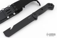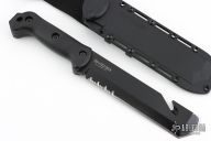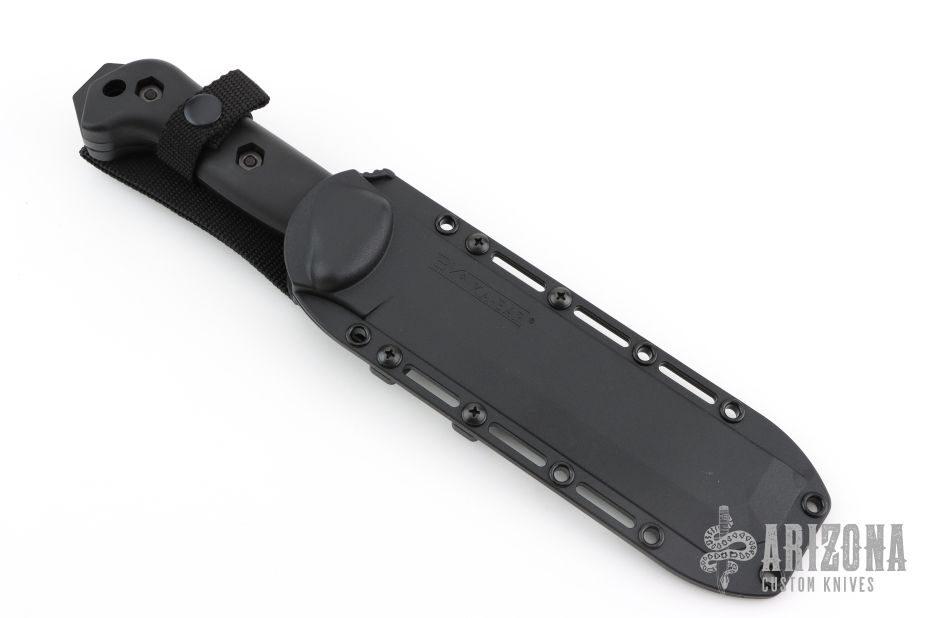 This Tactool from Becker Knife & Tool and Ka-Bar features a black chisel ground partially serrated blade with gut hook, .257" blade stock and 1.659" blade depth, full tang construction. The handle is comprised of black scales with lanyard hole in pommel. Comes with original box, papers and kydex sheath. Excellent condition.