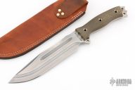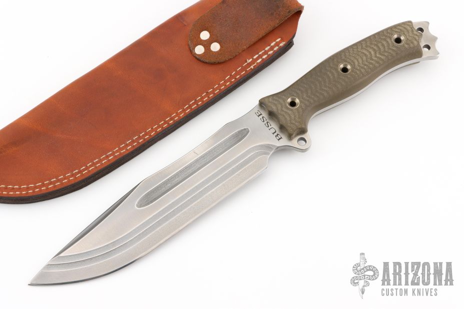 This Hell Razor 2 from Busse features a competition finished blade with fullers and green G-10 scales, .209" blade thickness and 1.810" blade depth, full tang construction. Has large fullers on blade and corrugated bevel technology. Comes with a brown leather sheath. Excellent condition.