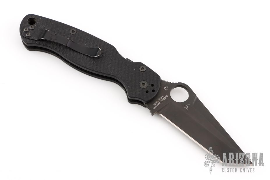 This G81GM4BKP2 Paramilitary 2 by Spyderco features a black tanto blade with thumb hole, notched thumb ramp and choil. The handle has textured black G10 scales over a stainless steel subframe and lockbar. 4 way adjustable pocket clip and lanyard tube in pommel. Includes original box and paperwork. Has some light scuffs, and some wear on the clip, otherwise excellent condition.