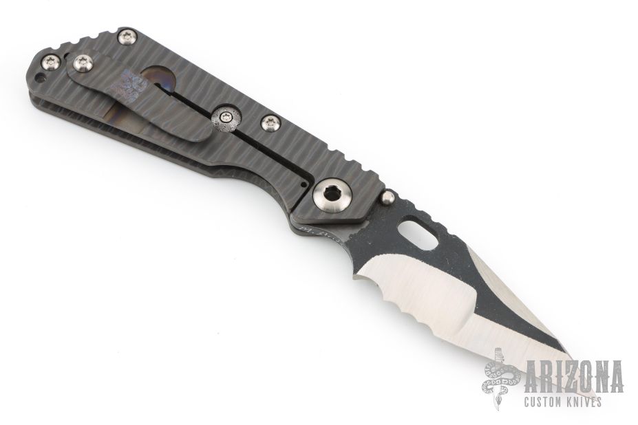 This MSC SNG framelock folder features a nightmare ground partially serrated blade with black textured flats, thumbhole and notched thumbrest. The handle has a flamed titanium frame with matching tip up clip. Has the batwing logo laser engraved on the frame. Nice lockup, detent and blade seating. Excellent condition. Comes with a zippered case.