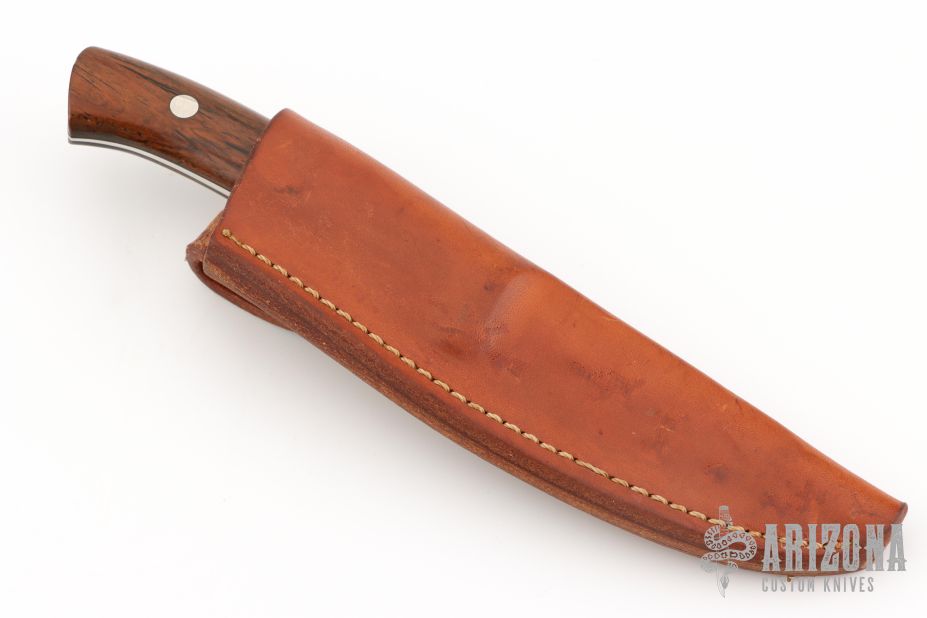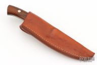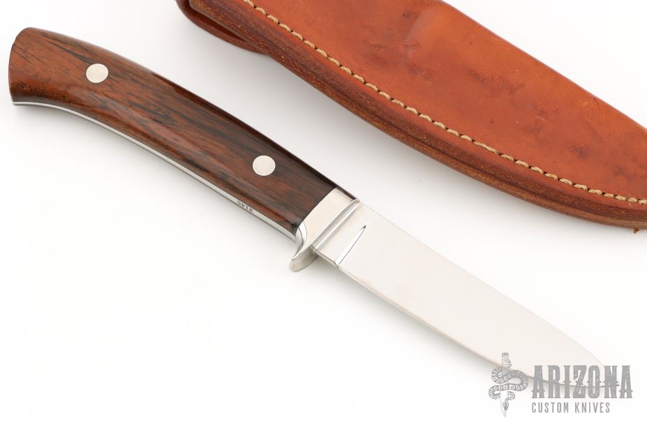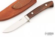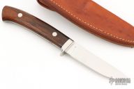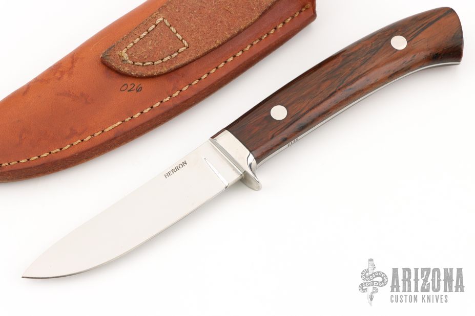 This fixed blade knife from George Herron features a mirror polished blade, .120" blade stock and .794" blade depth, full tapered tang construction. The handl has a polished stainless steel guard and wood scales with black liners. Nice lightweight hunter. Very comfortable.  The sheath is numbered 026.  The tang is numbered 2145 but fits the sheath perfectly.  Includes a brown leather sheath. Excellent Condition.