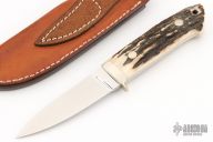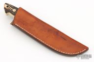 This Semi-Skinner by the Late Masao Takahashi features a mirror polished blade with .163" blade thickness and 1.032" blade depth, full tapered tang construction. The handle has a nickel silver guard with stag scales. Comes with a brown leather sheath. Excellent condition.