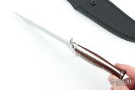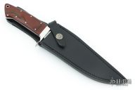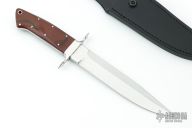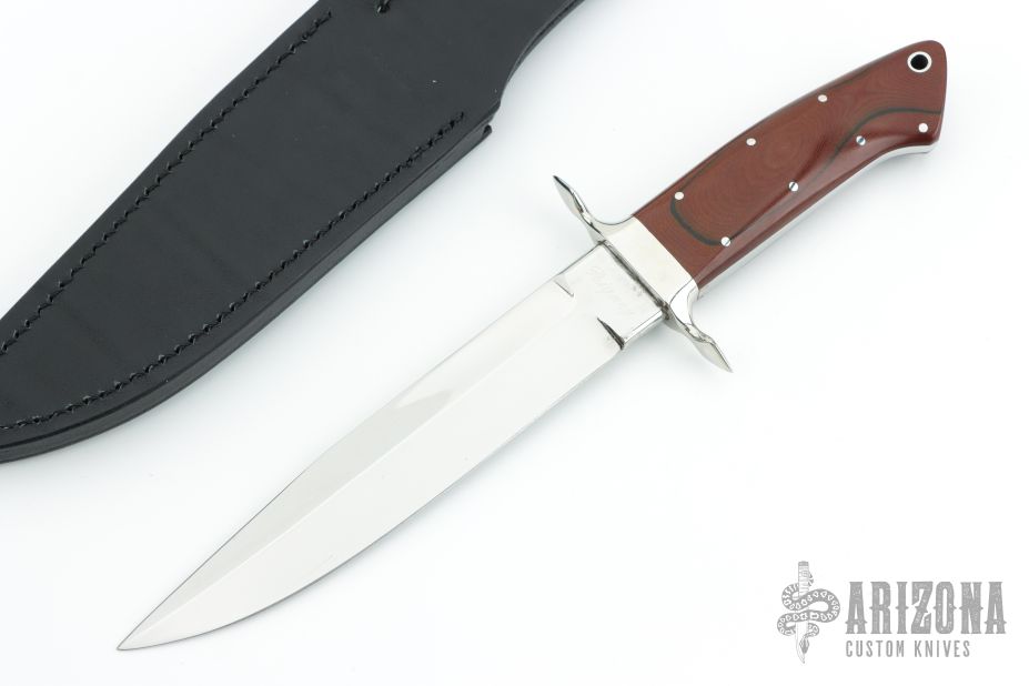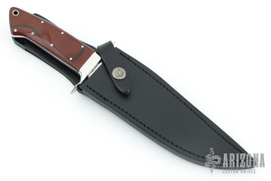 This Fighter by Willie Rigney features a mirror finished blade with sharpened top edge, .247" blade stock and 1.135" blade depth, full tapered tang construction. The handle has a mirror polished stainless steel guard with linen micarta scales. Comes with a black leather sheath, not original to the knife, but fits nicely. Has a couple light scratches, otherwise excellent condition.