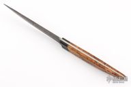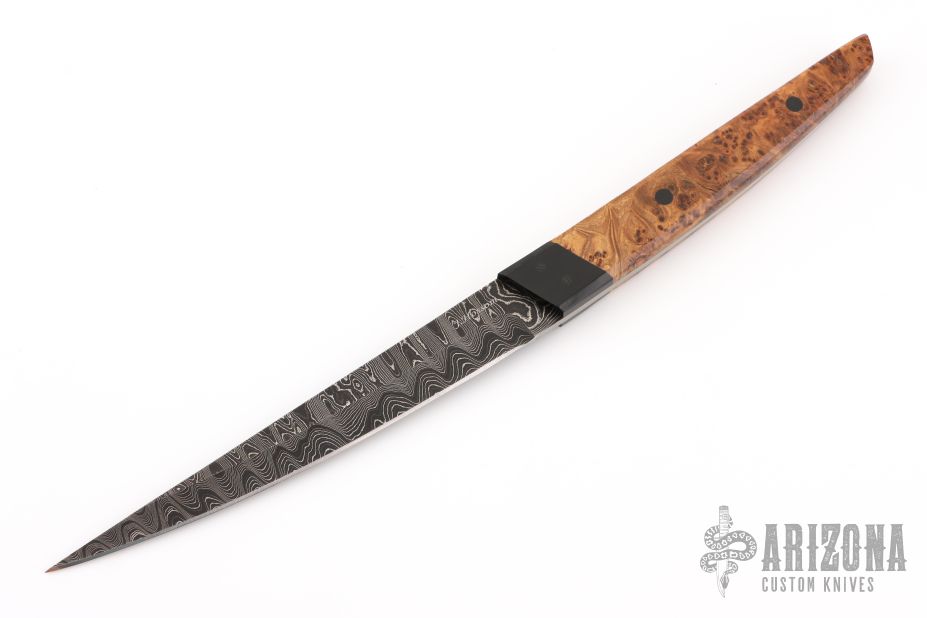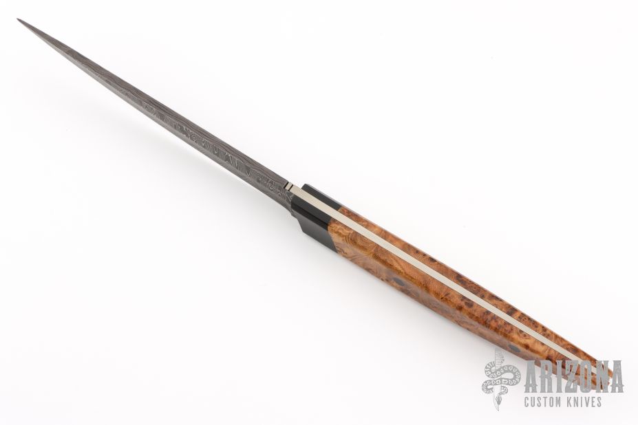This Tanto by Jerry Hossom features black paper micarta bolsters, Red Elm burl scales and black pins. Alabama Damascus blade with .179" blade stock and .978" blade depth, full tapered tang construction. Includes a zippered case. Excellent condition.