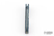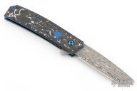 The Benchmade 601-211 Gold Class Tengu is a fully upscale version of the popular 601 flipper. This special edition knife features BiFrost Pattern Damasteel blade, white/black marbled carbon fiber scales, dual blue G-10 inlaid shields, sapphire blue PVD coated stainless steel liners and hardware, Raffir UV reactant SFX Blue Uranium with imbedded brass mesh backspacer. #2919. Excellent condition. Comes with original box, pouch and papers. Listing also includes a leather pocket sheath.
