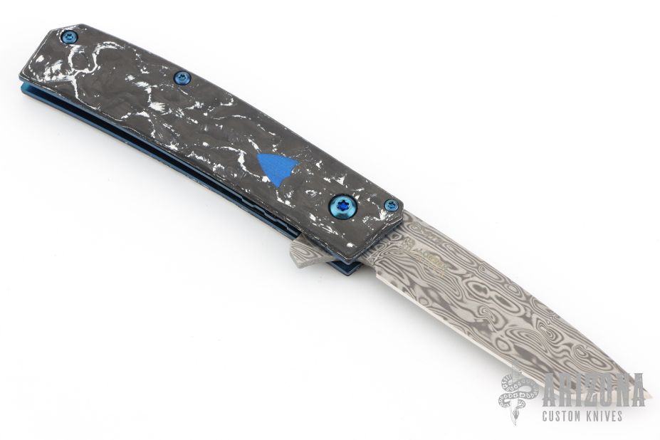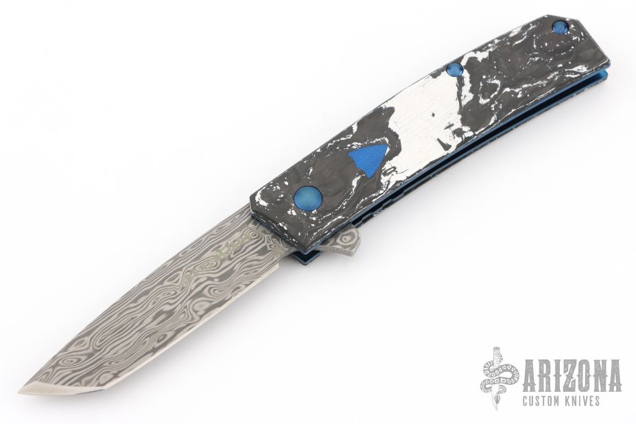 The Benchmade 601-211 Gold Class Tengu is a fully upscale version of the popular 601 flipper. This special edition knife features BiFrost Pattern Damasteel blade, white/black marbled carbon fiber scales, dual blue G-10 inlaid shields, sapphire blue PVD coated stainless steel liners and hardware, Raffir UV reactant SFX Blue Uranium with imbedded brass mesh backspacer. #2919. Excellent condition. Comes with original box, pouch and papers. Listing also includes a leather pocket sheath.