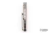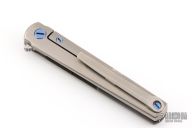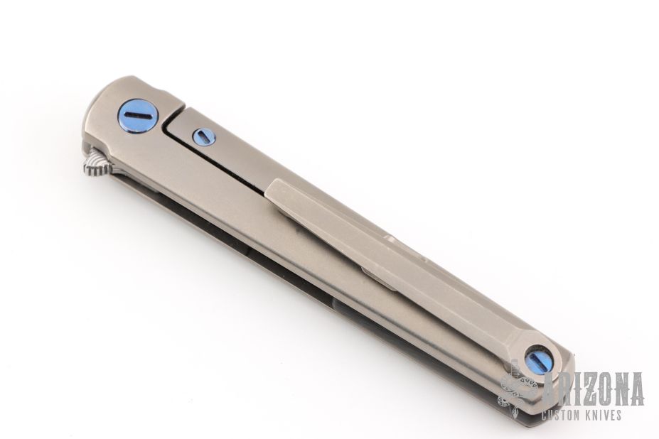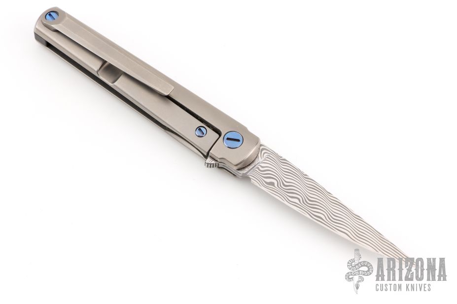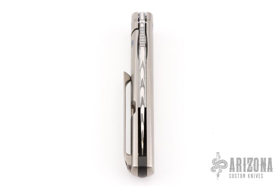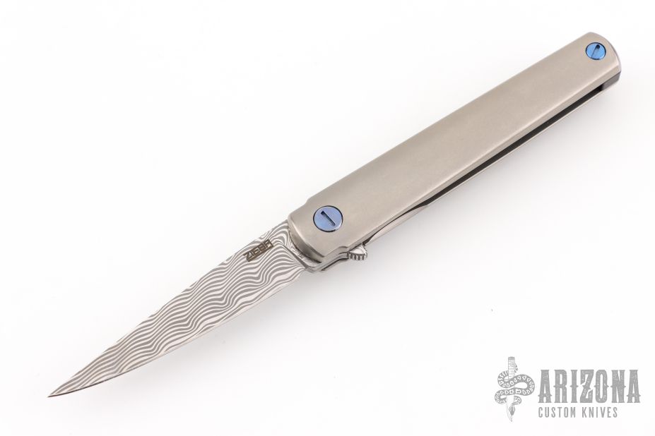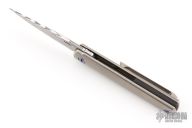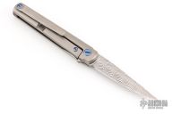 This MS3 Manhattan Special by Michael Zieba features a Damasteel blade with notched thumbrest and flipper. The handle has a blasted titanium frame with matching tip up clip and anodized titanium hardware, carbon fiber backspacer, has stainless steel lockface insert. Rides on bearings, nice detent, lockup and blade seating. Comes with original zippered case and COA. Has some light scuffs and scratches, great condition otherwise.