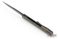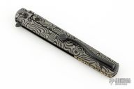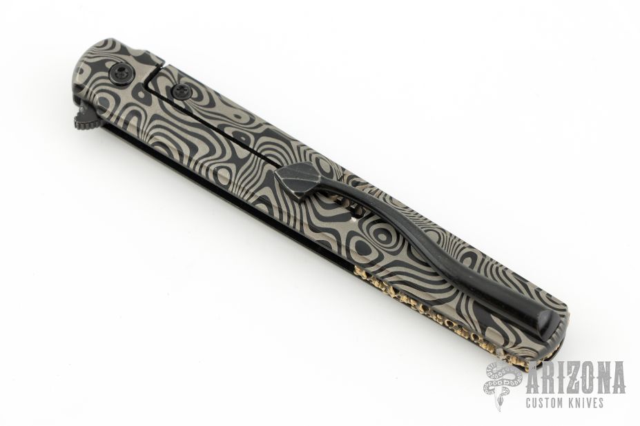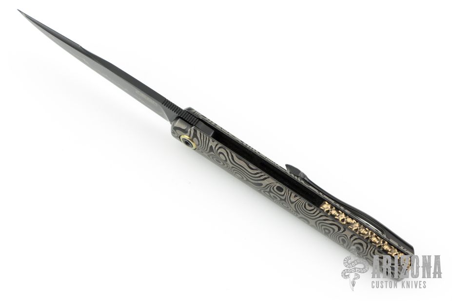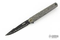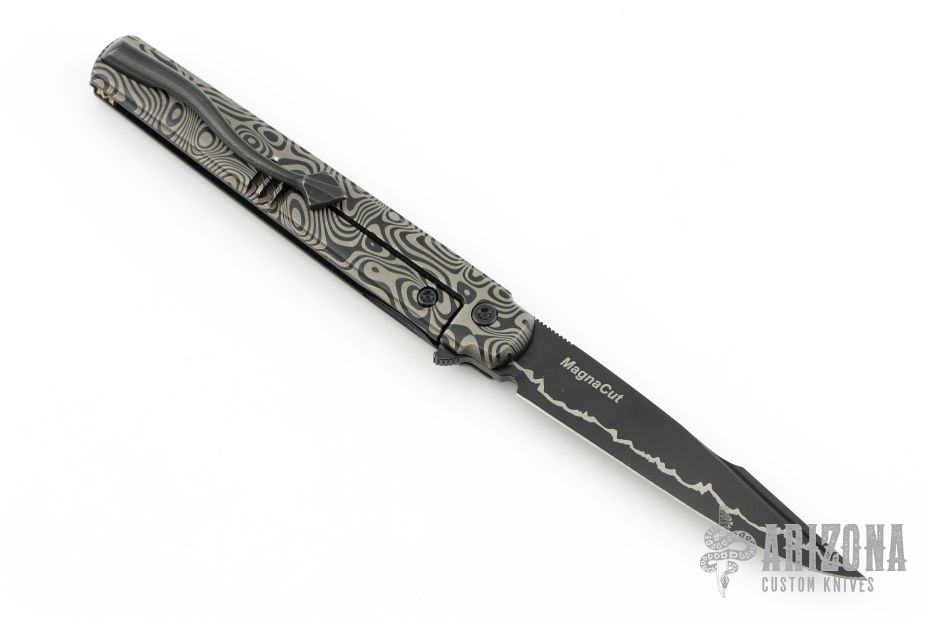 This Six framelock flipper by Michael Zieba features a black Magnacut blade with notched thumbrest and false top edge. The handle has a black titanium frame with matching tip up clip, anodized titanium pivot collar. Comes with zippered case and COA dated 1-18-23. Has a few light scratches, otherwise Excellent condition.