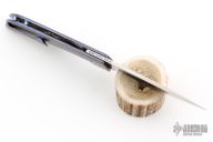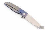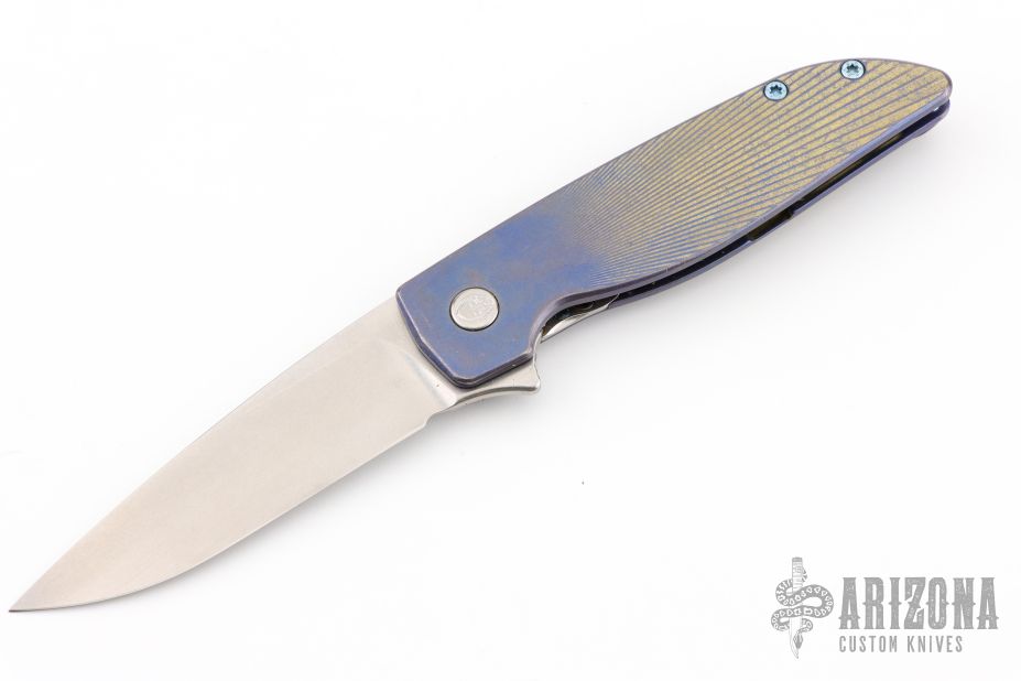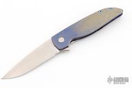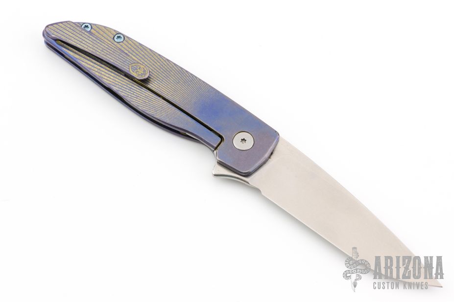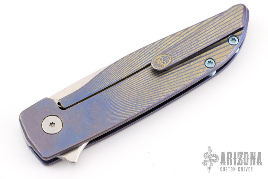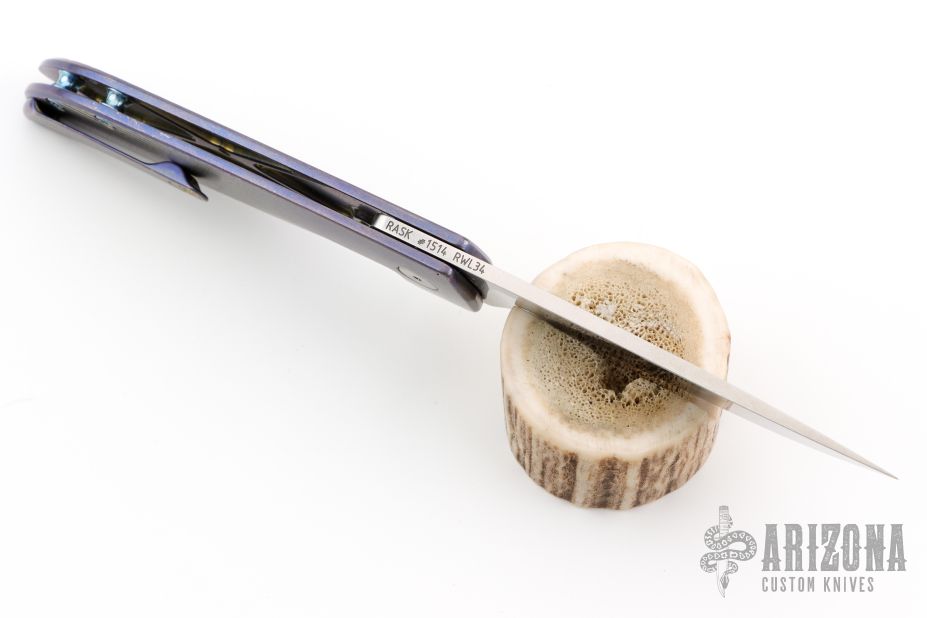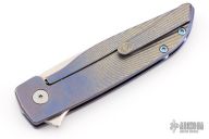 This Rask by John Grimsmo of Grimsmo Knives features a stonewash finished blade with notched flipper. The handle has a "Starburst" milled, anodized and tumbled titanium frame with matching tip up clip that has hidden screws, titanium barrel spacers and screws. Numbered #1514 on the spine of the blade. Includes original box and COA dated Jan 17, 2023. Excellent condition.